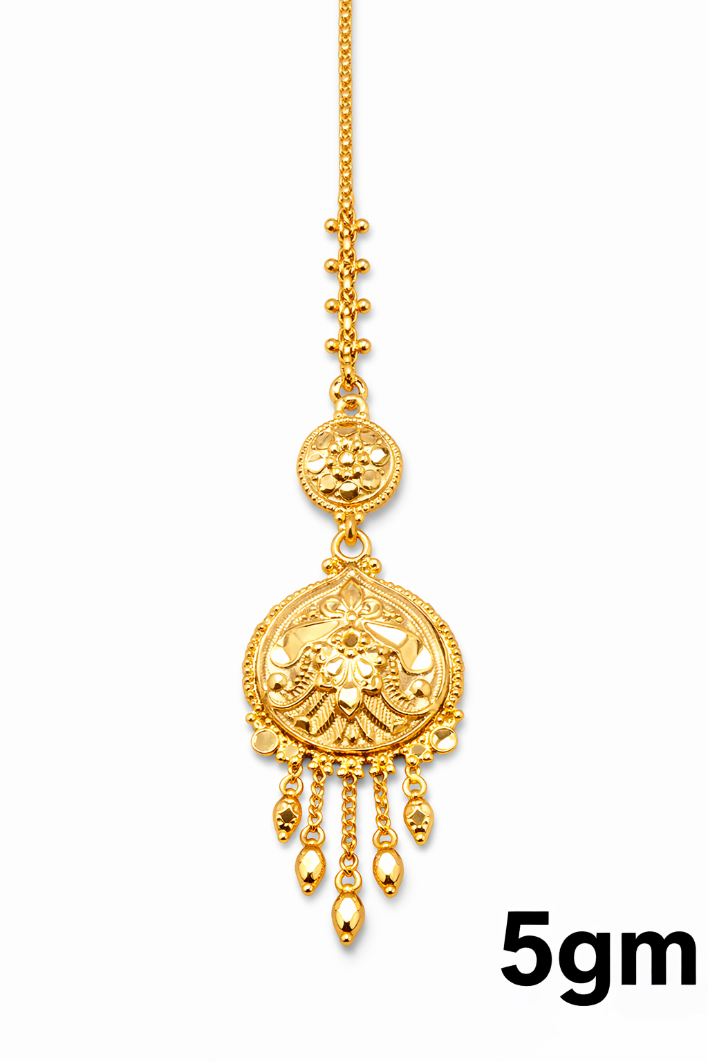 This beautifully detailed gold mang tika features a traditional round pendant with intricate floral carving, offering a rich and elegant bridal look. The design combines layered textures with smooth polish, making it suitable for weddings and grand festive occasions.