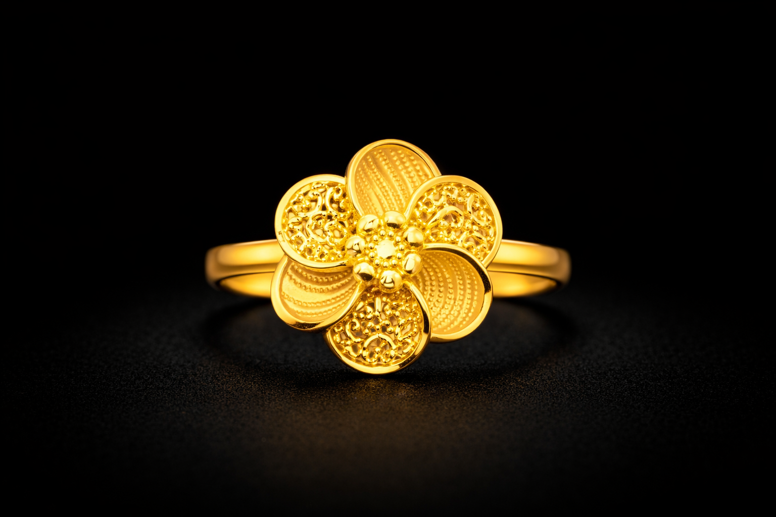 This elegant gold ring features a beautiful flower-shaped design that gives it a graceful and feminine look. The centerpiece is crafted with five rounded petals arranged around a small decorative center. Each petal has a unique texture, combining smooth polished surfaces with finely detailed patterns that add depth and shine.