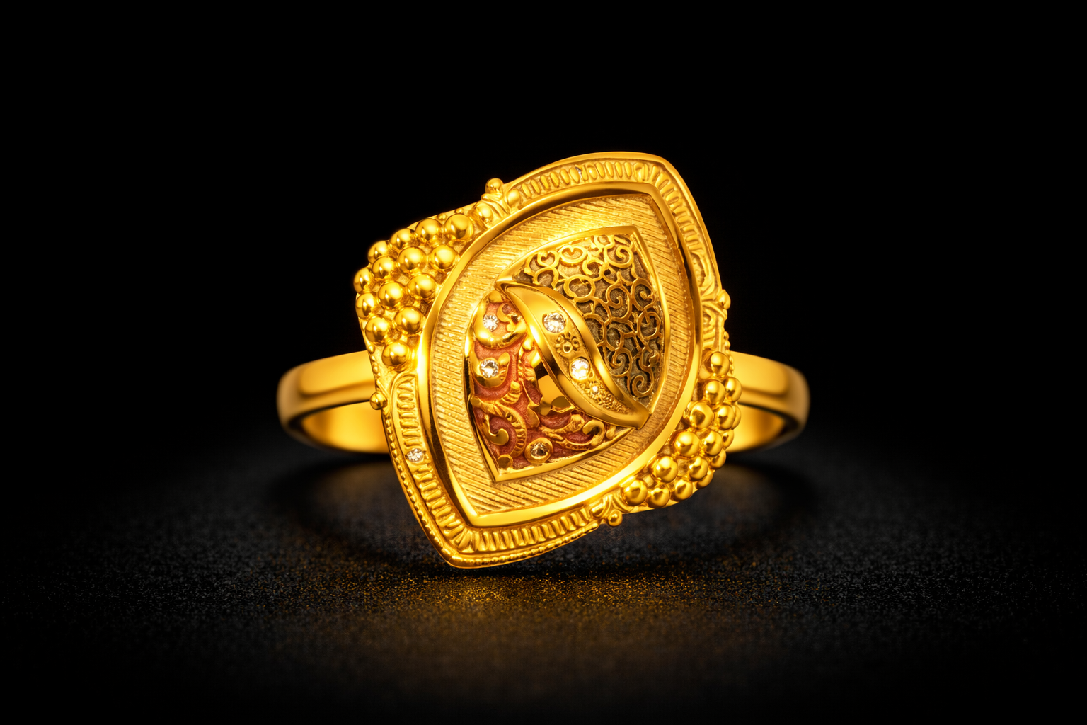 Designer Shield Shape Gold Ring with Filigree and Enamel Detailing