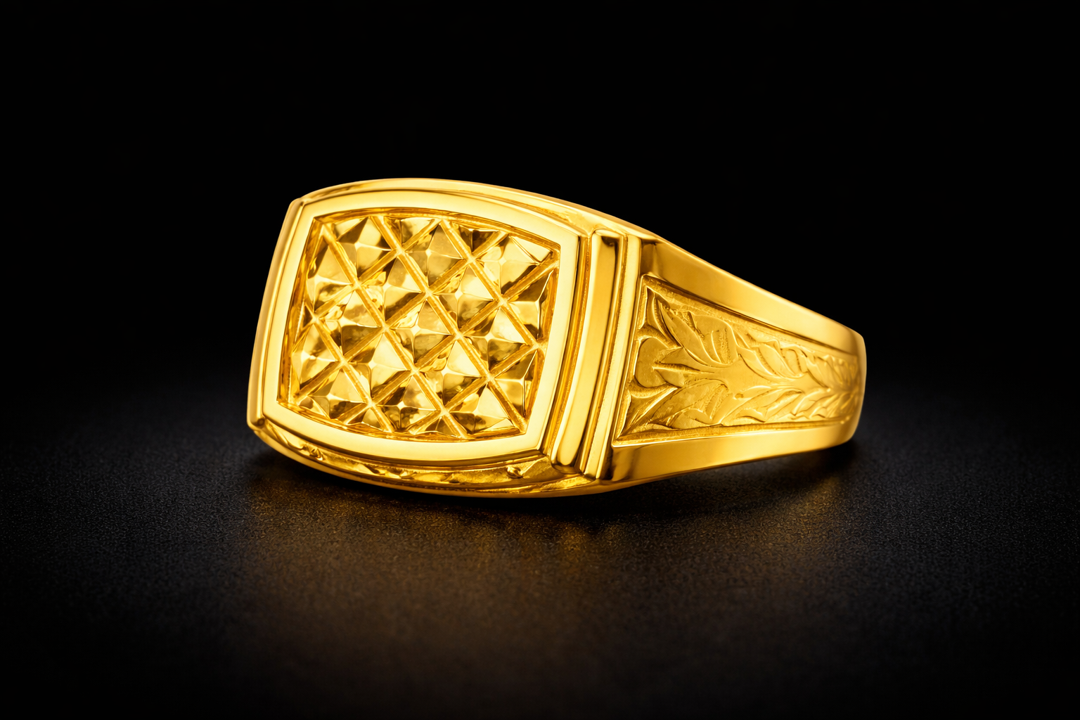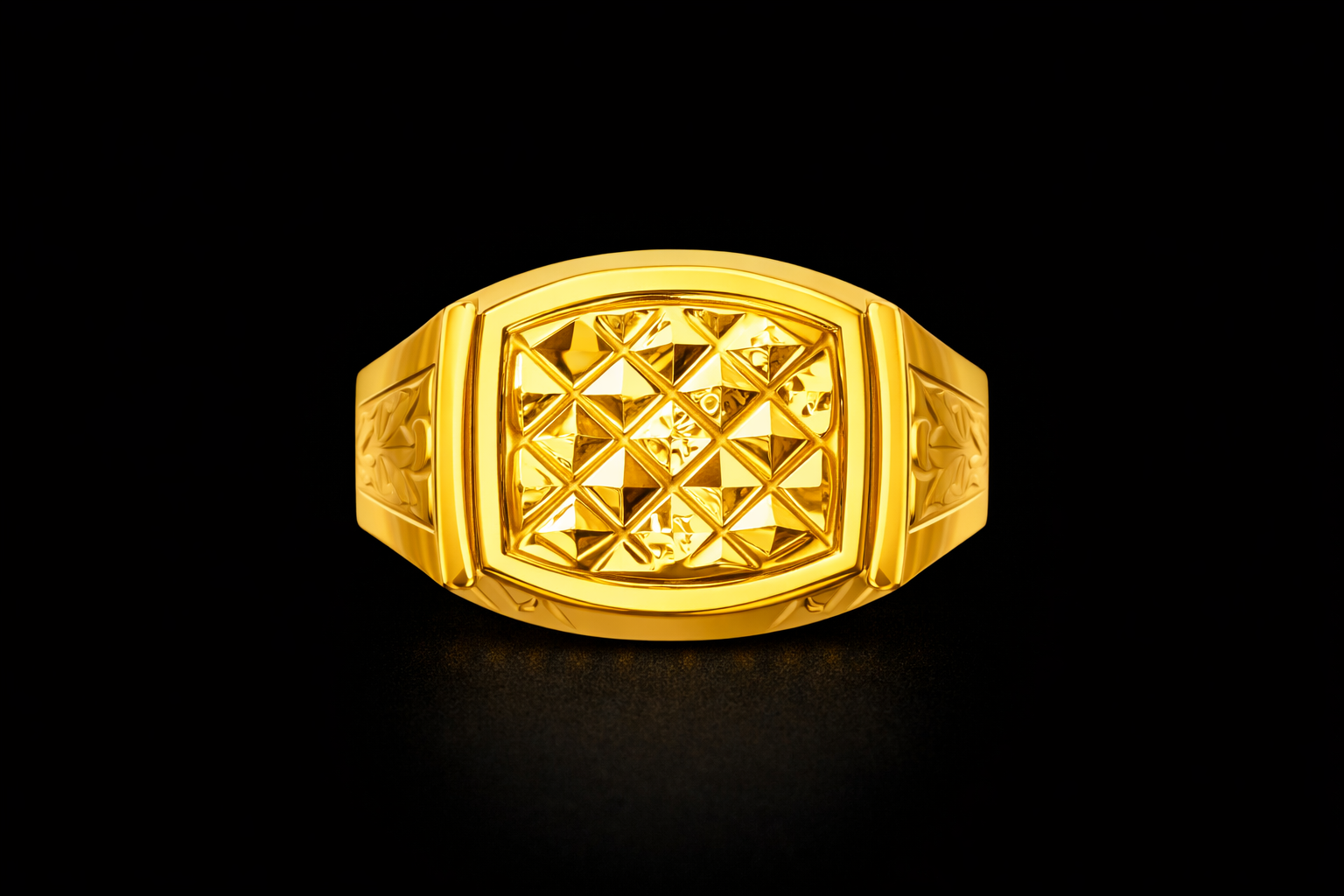 This gold ring has a square shape on top. The top part has small diamond shape pattern which makes the ring look special and attractive.