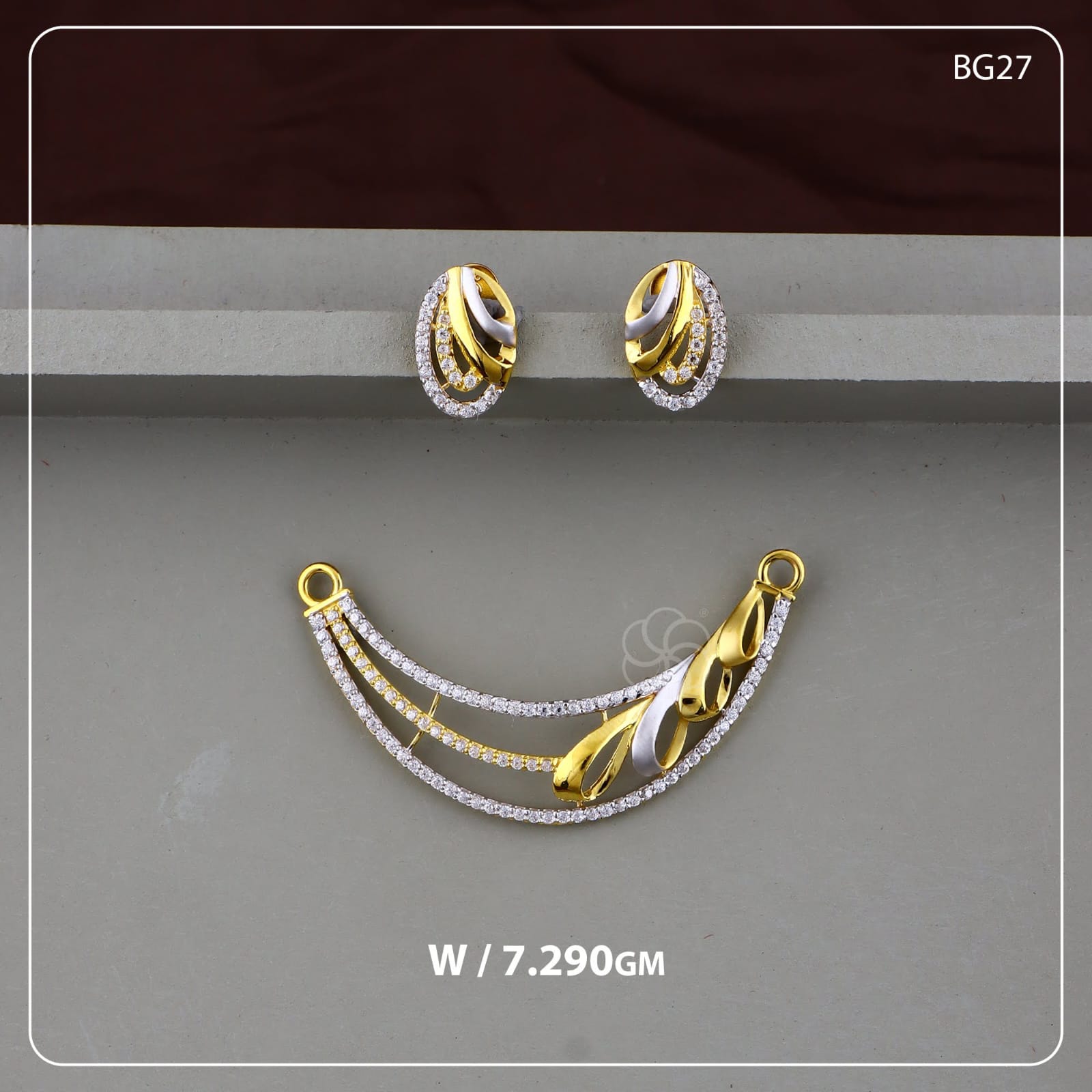 The earrings follow the same design language with a curved dual-tone pattern and stone border, keeping the set well coordinated.