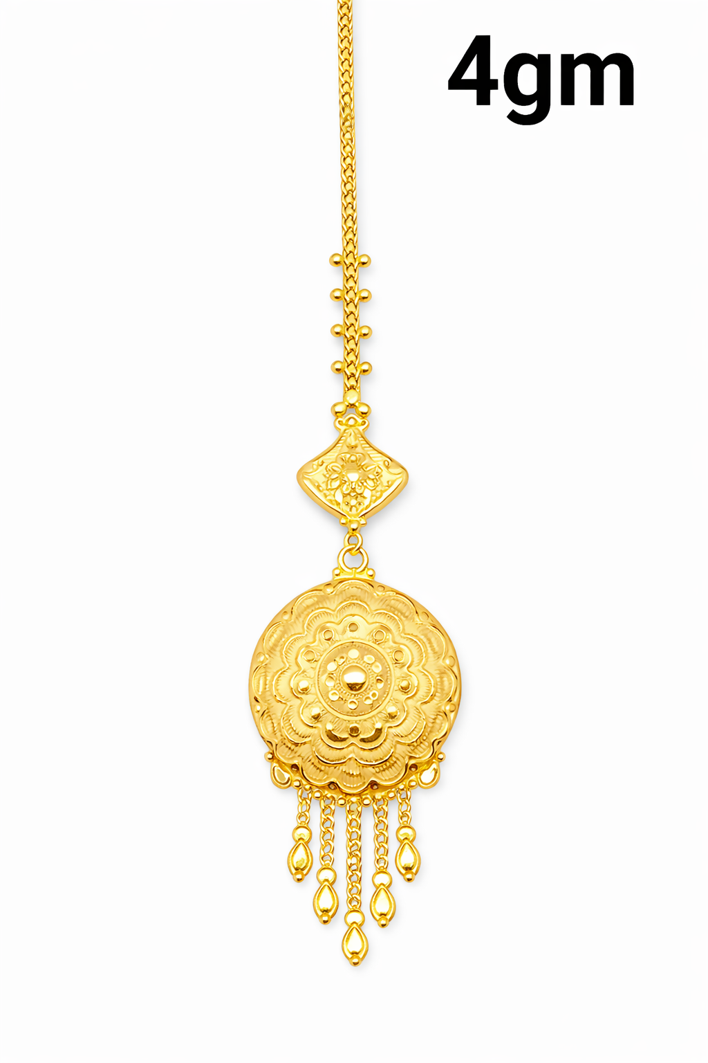 This beautifully crafted gold mang tika features a classic round mandala-inspired centerpiece with detailed floral layering. The design reflects traditional Indian artistry while maintaining a clean and elegant finish.