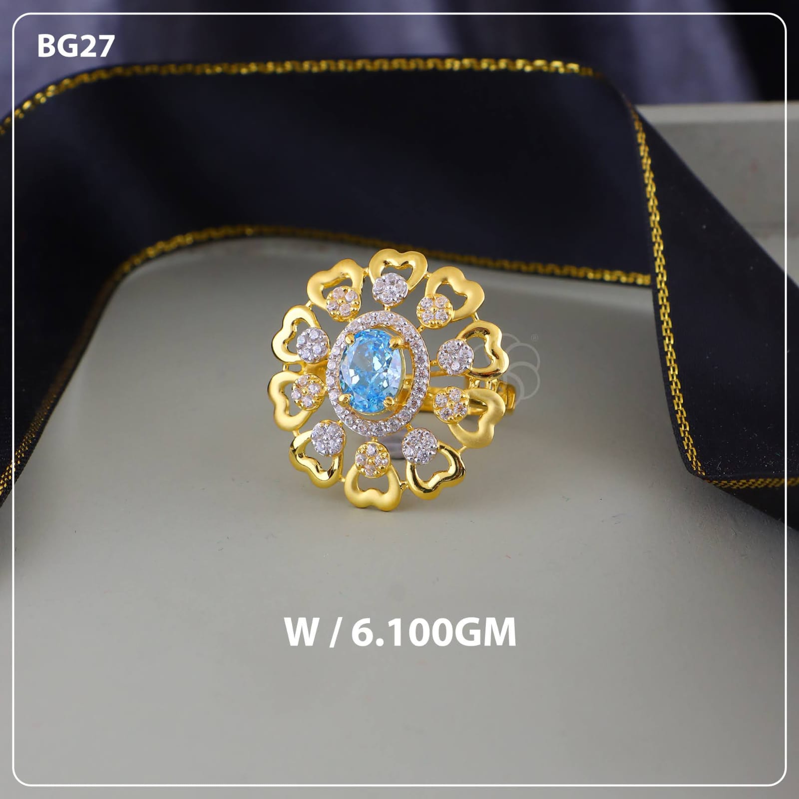 What makes this piece unique is the outer layer of heart-shaped gold patterns. These hearts are arranged in a floral layout, giving the ring a delicate and slightly playful feel while still looking premium.