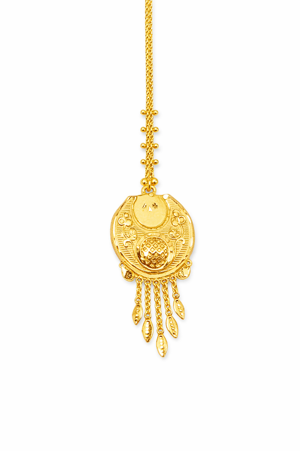 This beautifully crafted gold mang tika features a compact round centerpiece inspired by classic heritage jewellery designs. The surface is detailed with fine engraved lines and textured patterns that give the piece depth and richness.