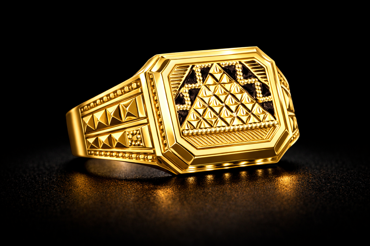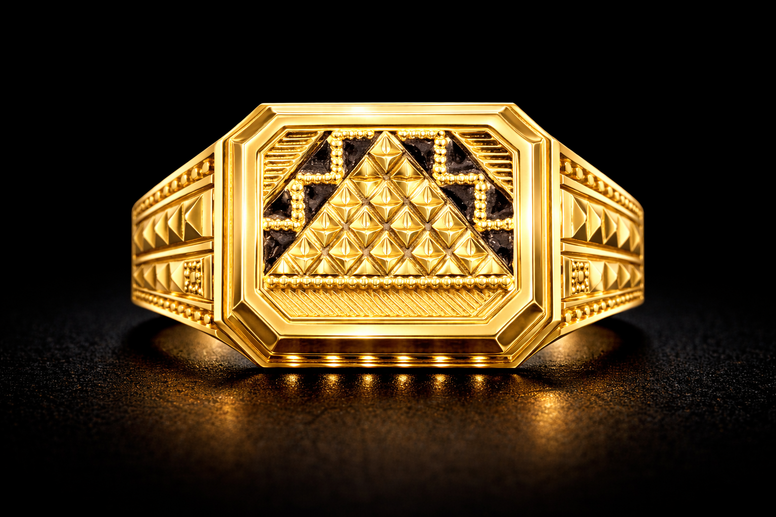 This gold ring has a hexagon shape on top. The center part has a triangle pyramid design with small raised patterns. The background has dark finish which makes the gold design stand out more clearly.
