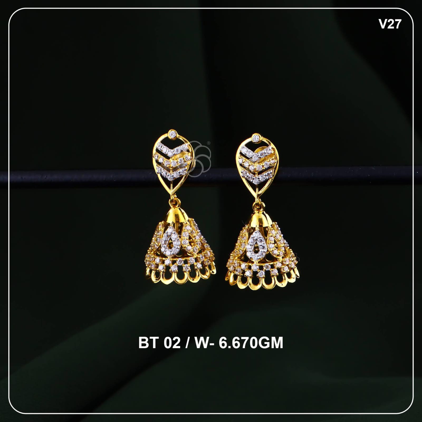 This pair has a very graceful mix of modern pattern and traditional jhumka style. The top portion is designed like a leaf shape, with layered stone lines that give a clean, structured look.