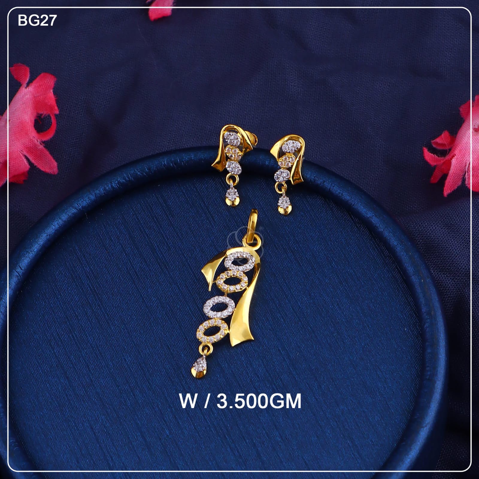 The earrings follow the same idea with a curved top, stone detailing, and a small drop, keeping the overall look simple and well balanced.