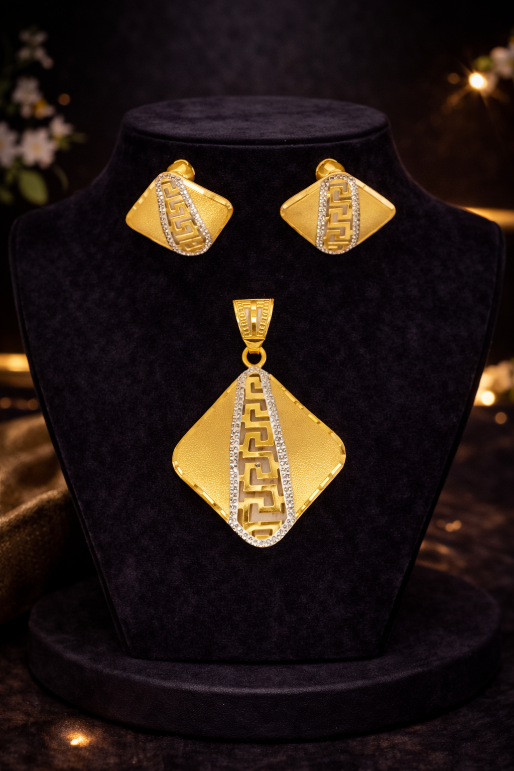 This elegant gold pendant set features a bold geometric design crafted in a diamond shaped silhouette. The pendant has a soft matte textured surface that gives it a rich and contemporary appearance.