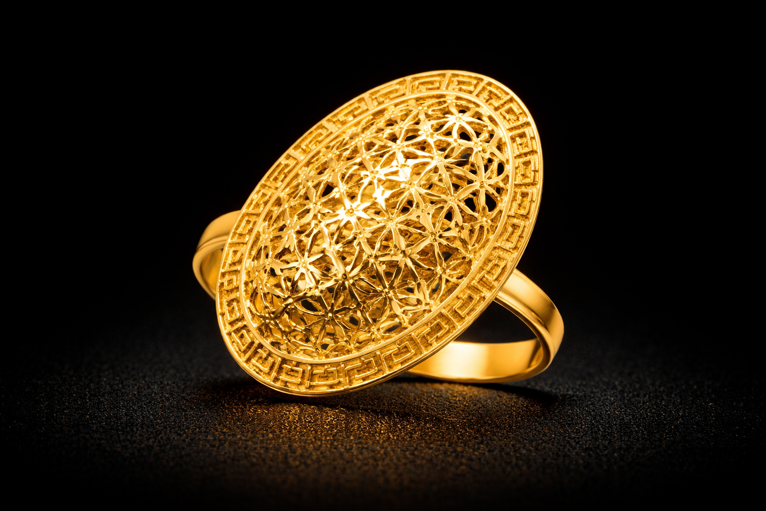 The polished gold band provides a smooth and comfortable fit while allowing the ornate oval top to remain the focal point of the design. The combination of detailed filigree and geometric framing makes this ring both artistic and luxurious.