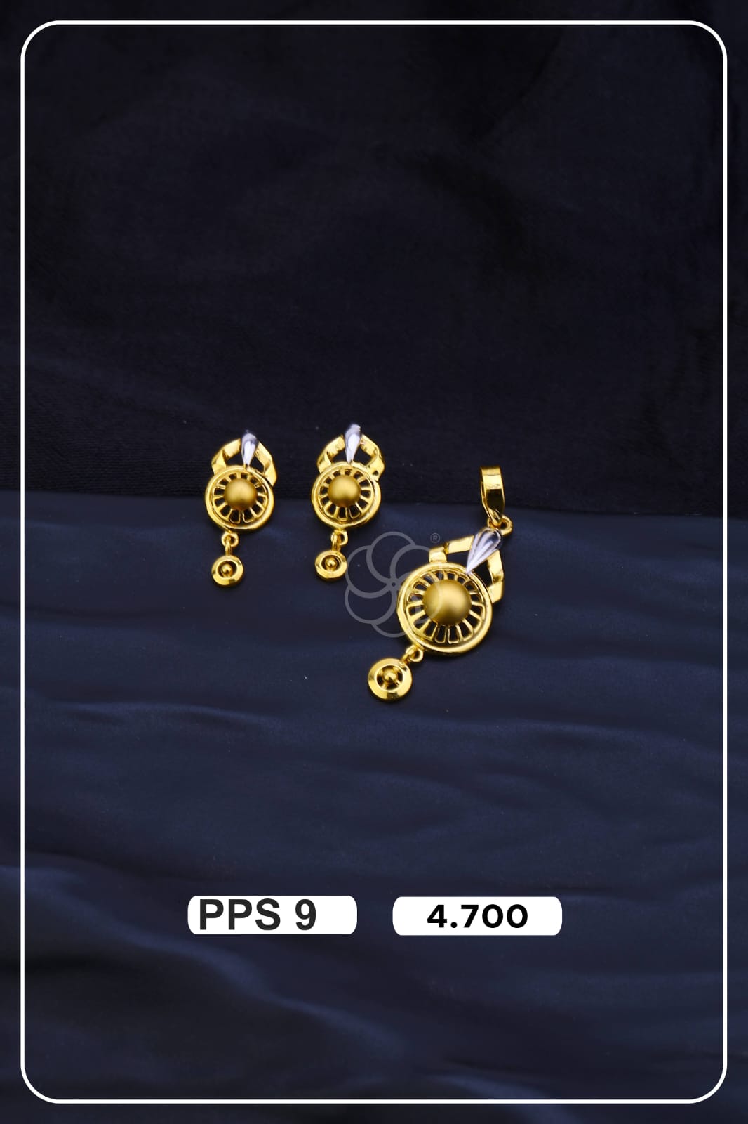 This set has a very clean and classic look with a touch of modern detailing. The design is built around a round wheel-like motif, with a smooth gold center and fine radial pattern around it, giving it a balanced and elegant feel.