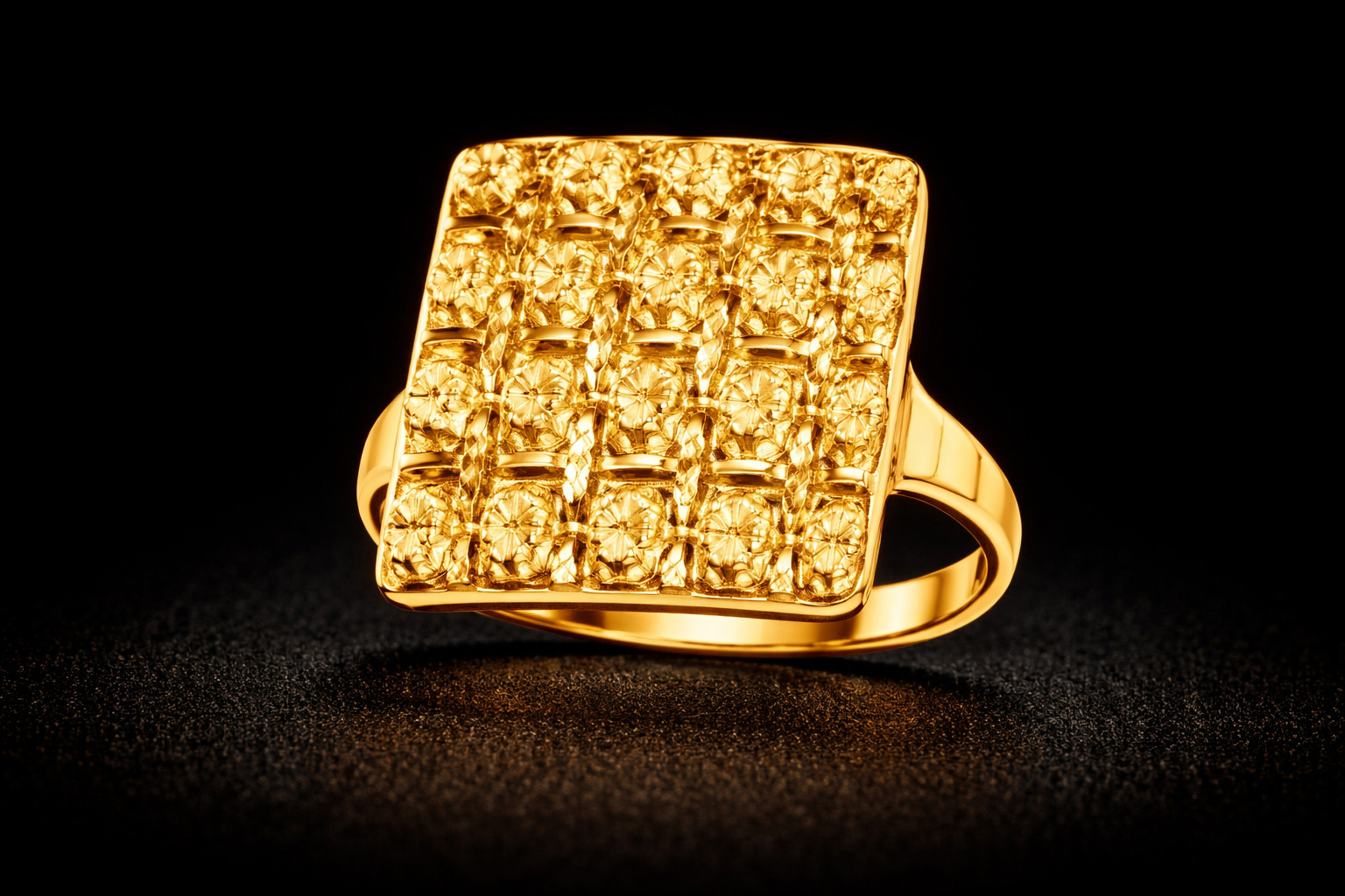 Square Floral Grid Gold Ring with Diamond-Cut Detailing