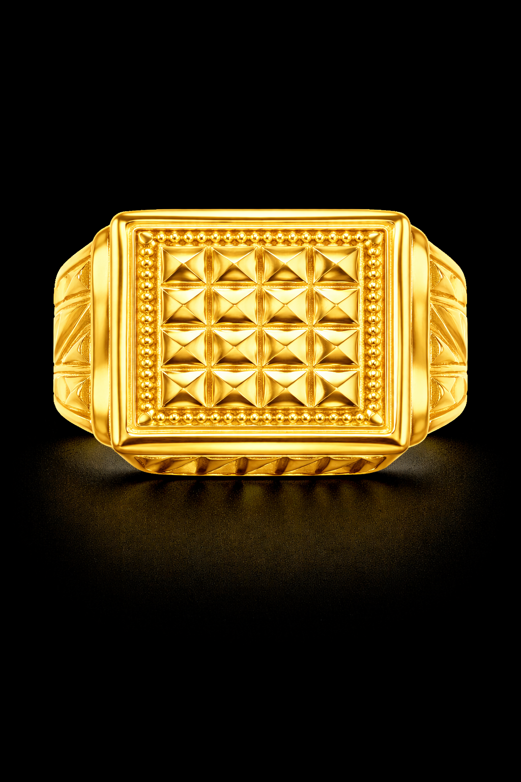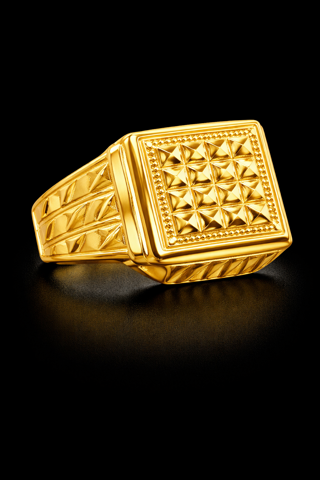 This gold ring has a square shape on top. The top part has small raised pattern design. It looks strong and attractive.