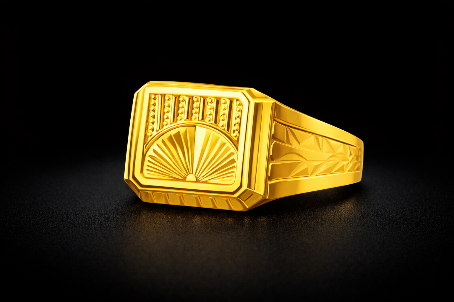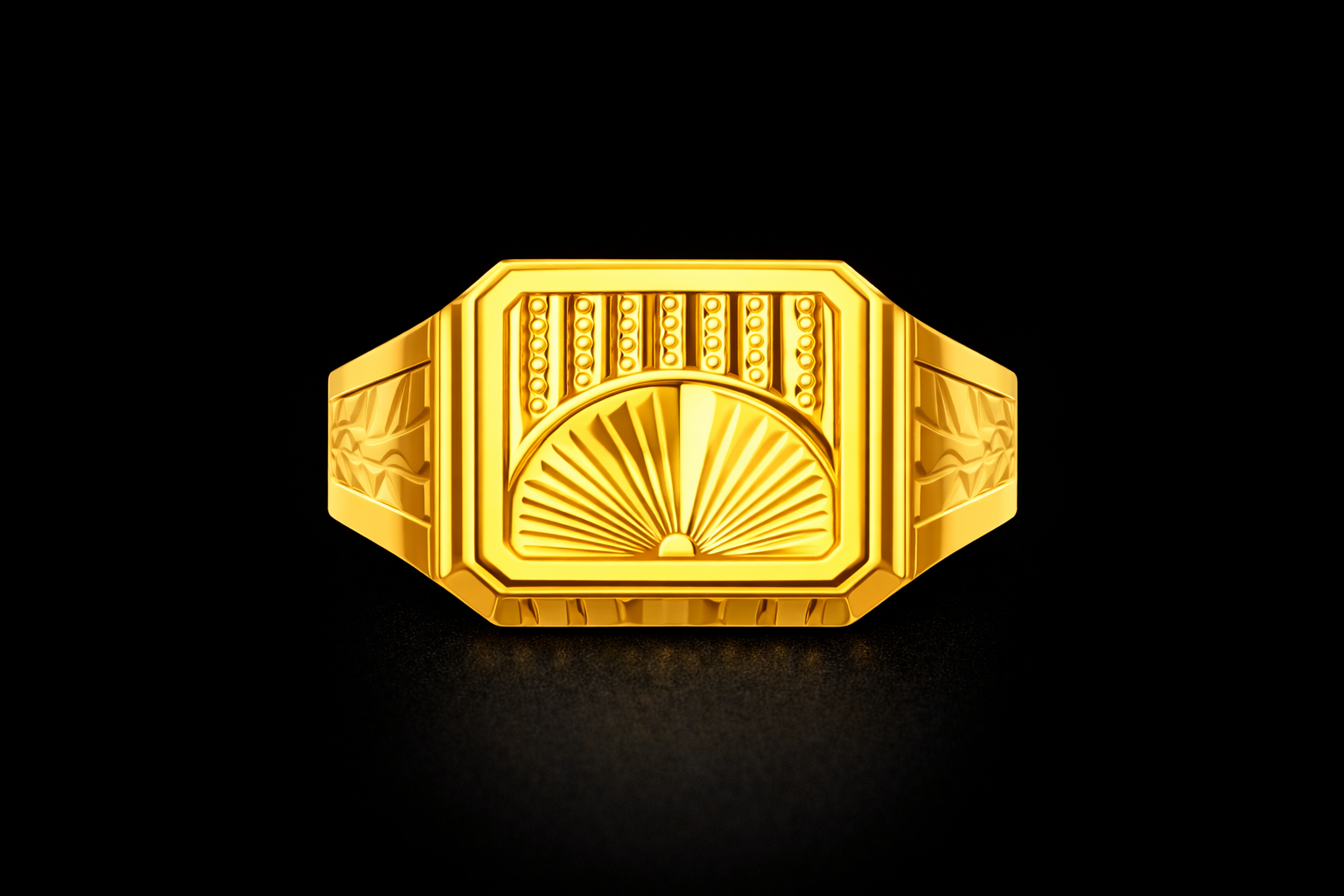 This gold ring has a square shape with sun design on the top. The lower part shows sun rays pattern which makes the ring look special and different.