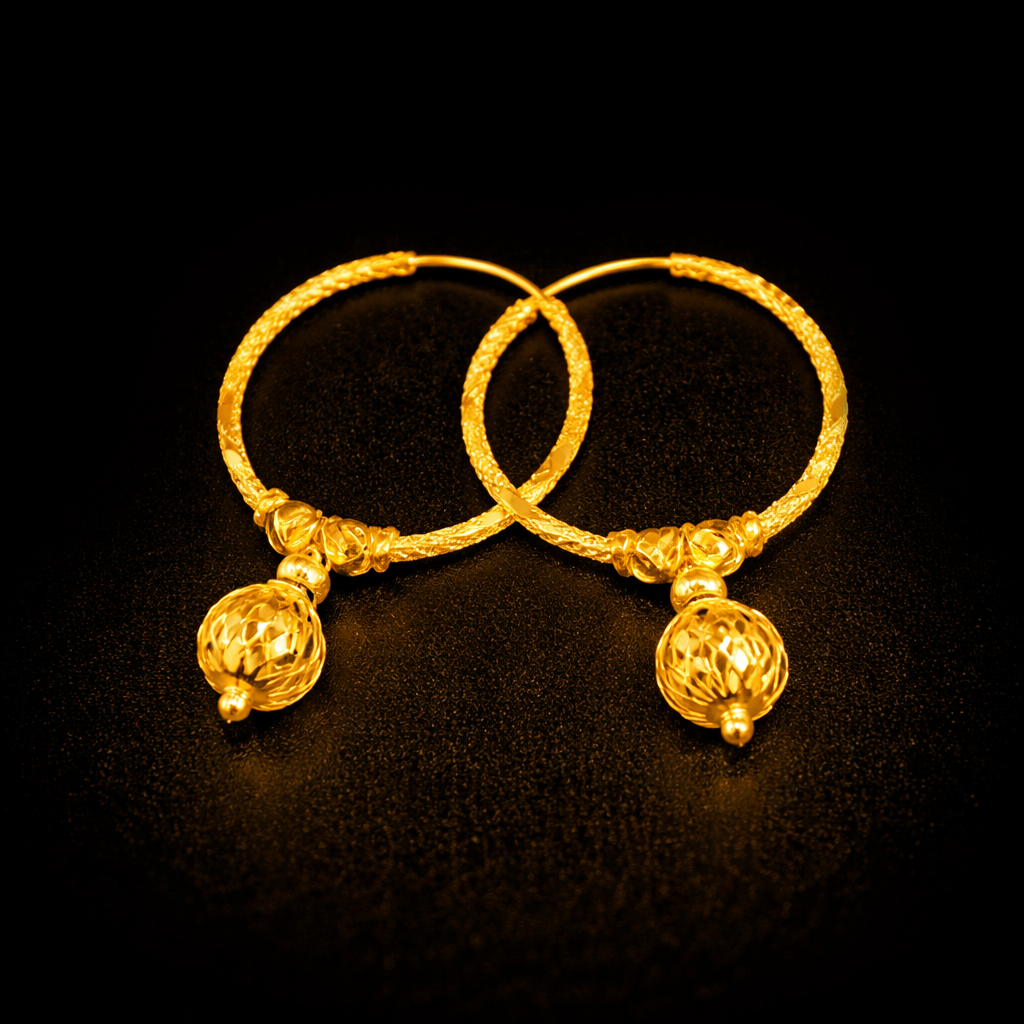 These elegant gold bali earrings feature a classic hoop design paired with a decorative hanging ball charm. The hoop has a finely textured surface that gives the earrings a rich and sparkling look. At the bottom, a beautifully crafted diamond-cut spherical bead hangs from the hoop, adding movement and shine to the design.