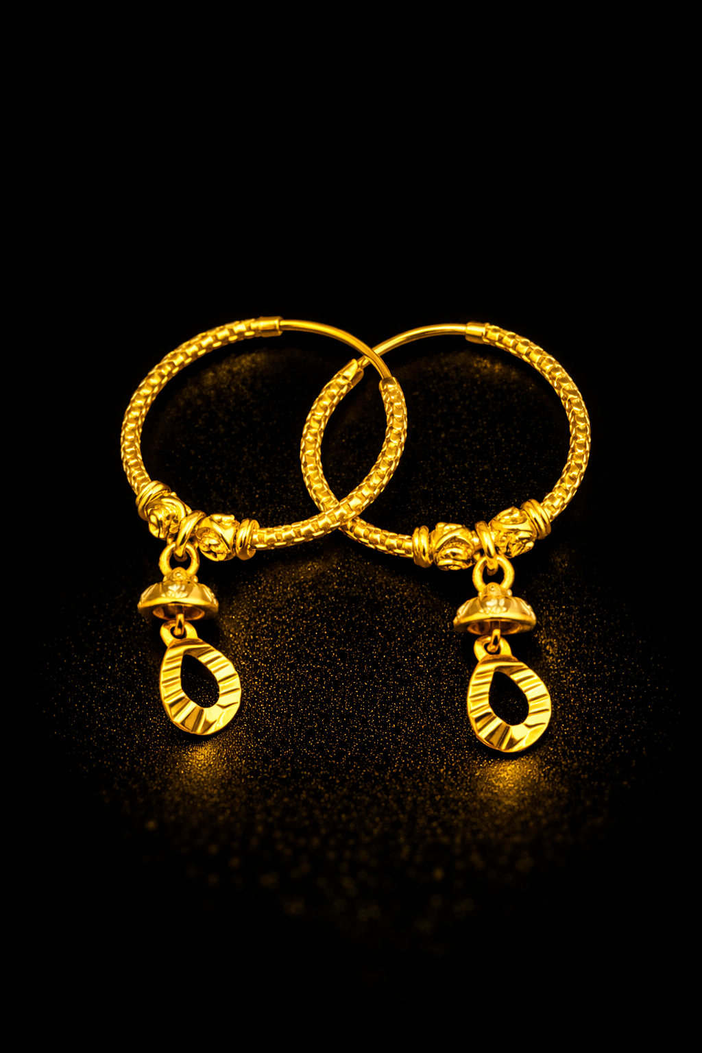 These elegant gold bali earrings feature a beautifully textured hoop design that adds shine and depth to the jewellery. The hoop is decorated with small ornamental beads and a hanging drop charm that enhances the overall traditional look. The dangling oval shaped charm creates gentle movement, giving the earrings a graceful and stylish appearance. The polished gold finish highlights the fine detailing and craftsmanship, making these bali earrings suitable for both everyday wear and festive occasions.