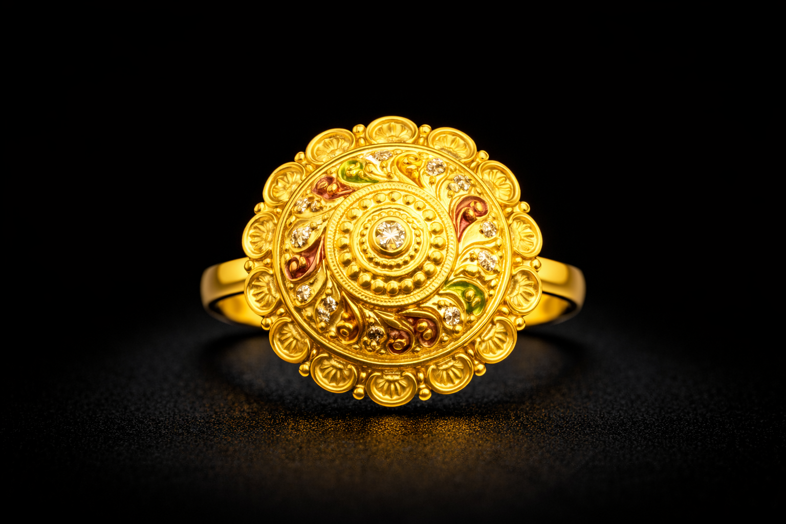 This elegant gold ring features a beautifully designed circular motif that reflects classic traditional craftsmanship. The ring showcases a layered ornamental pattern that combines fine gold detailing, colorful enamel accents, and sparkling stone elements.