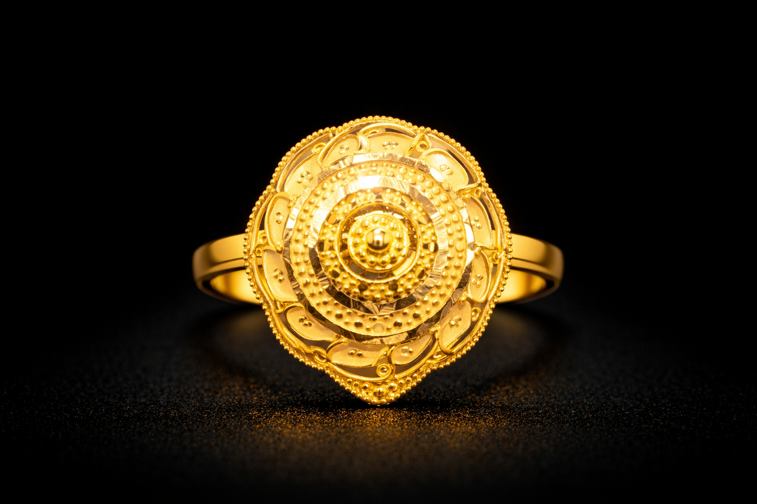 This beautifully crafted gold ring features a bold circular centerpiece designed with layered concentric patterns. The detailed structure creates a rich and ornamental look that reflects traditional craftsmanship.
