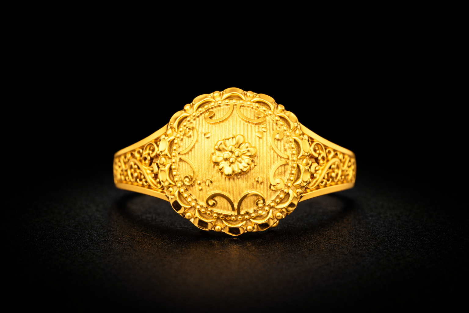 The sides of the ring are decorated with ornamental patterns that blend smoothly into the band, giving the ring a balanced and refined appearance. The detailed craftsmanship and polished gold finish make this ring a perfect piece for those who appreciate traditional jewelry with artistic detailing.