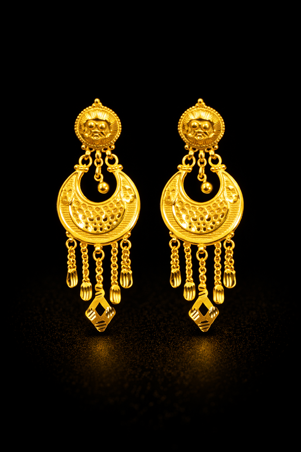 Traditional Gold Chand Bali Earrings with Detailed Crescent Design and Hanging Drops