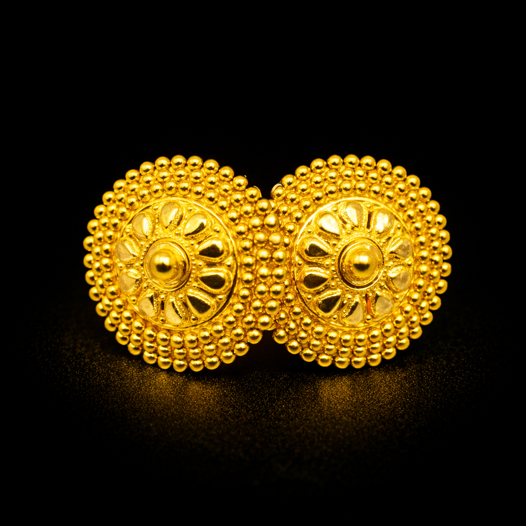 These traditional gold plated stud earrings feature a bold circular floral design surrounded by a rich beaded halo border. The intricate detailing and polished gold finish create a striking piece that reflects classic ethnic craftsmanship.