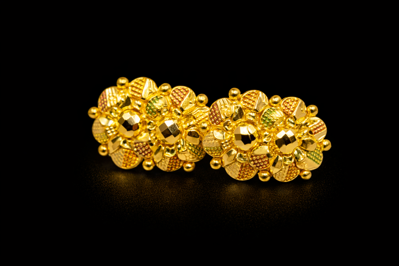 Around the center, the design forms a flower shape with petal like elements. Each petal has fine textured detailing and subtle multi tone accents in gold, red, and green shades. This combination gives the earrings a rich traditional appearance and enhances the overall design.