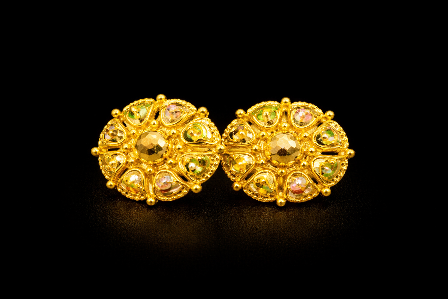 Around the center, the design forms a flower shape with petal like elements. Each petal contains small decorative stones in subtle shades of green, pink, and gold, adding a soft multi color effect that enhances the overall beauty of the earrings.
