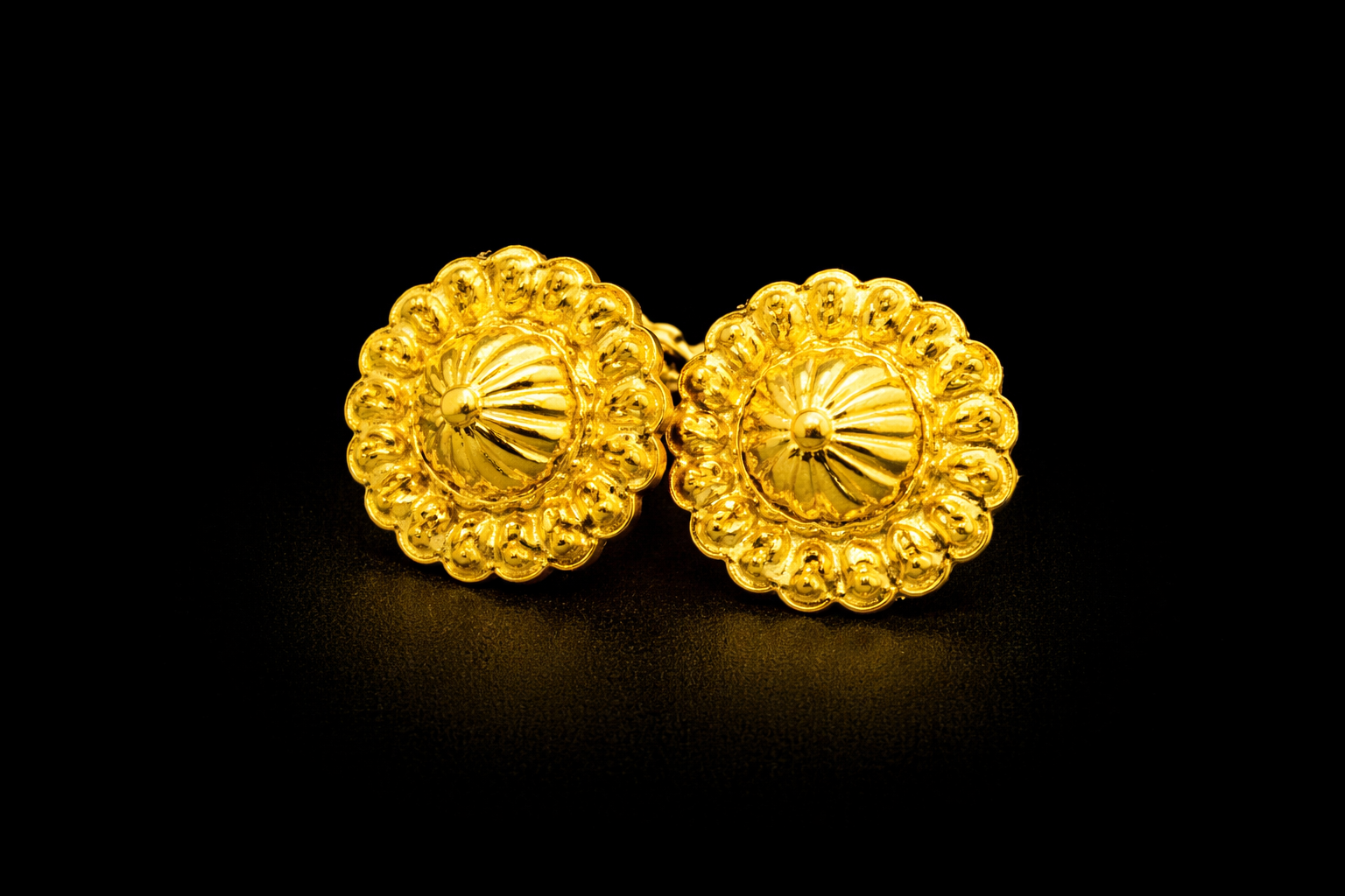 The polished gold finish highlights the intricate craftsmanship and gives the earrings a traditional yet timeless appeal. The combination of the ribbed dome center and the soft floral border creates a balanced and graceful design.