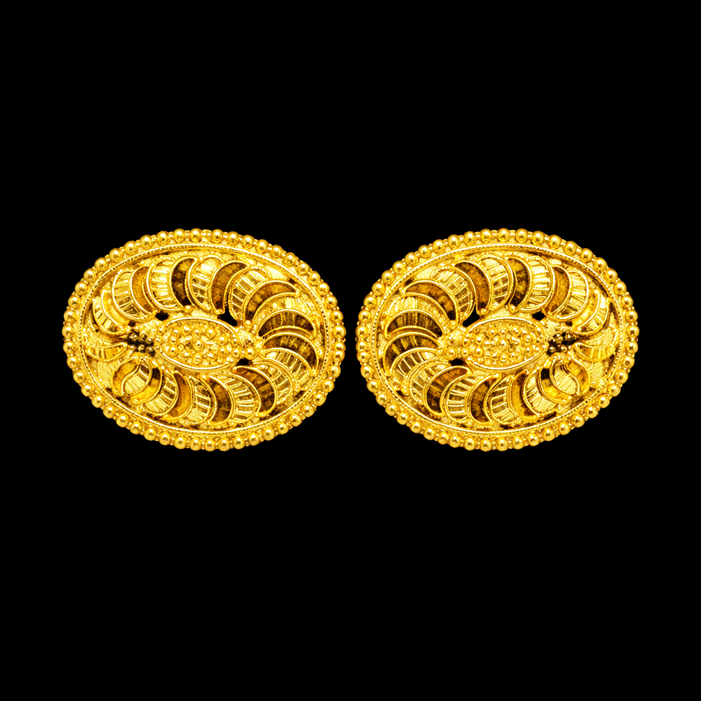 These elegant gold plated stud earrings feature a beautiful oval shape with detailed traditional patterns. The design has curved leaf style patterns arranged around the center, creating a balanced and decorative look.