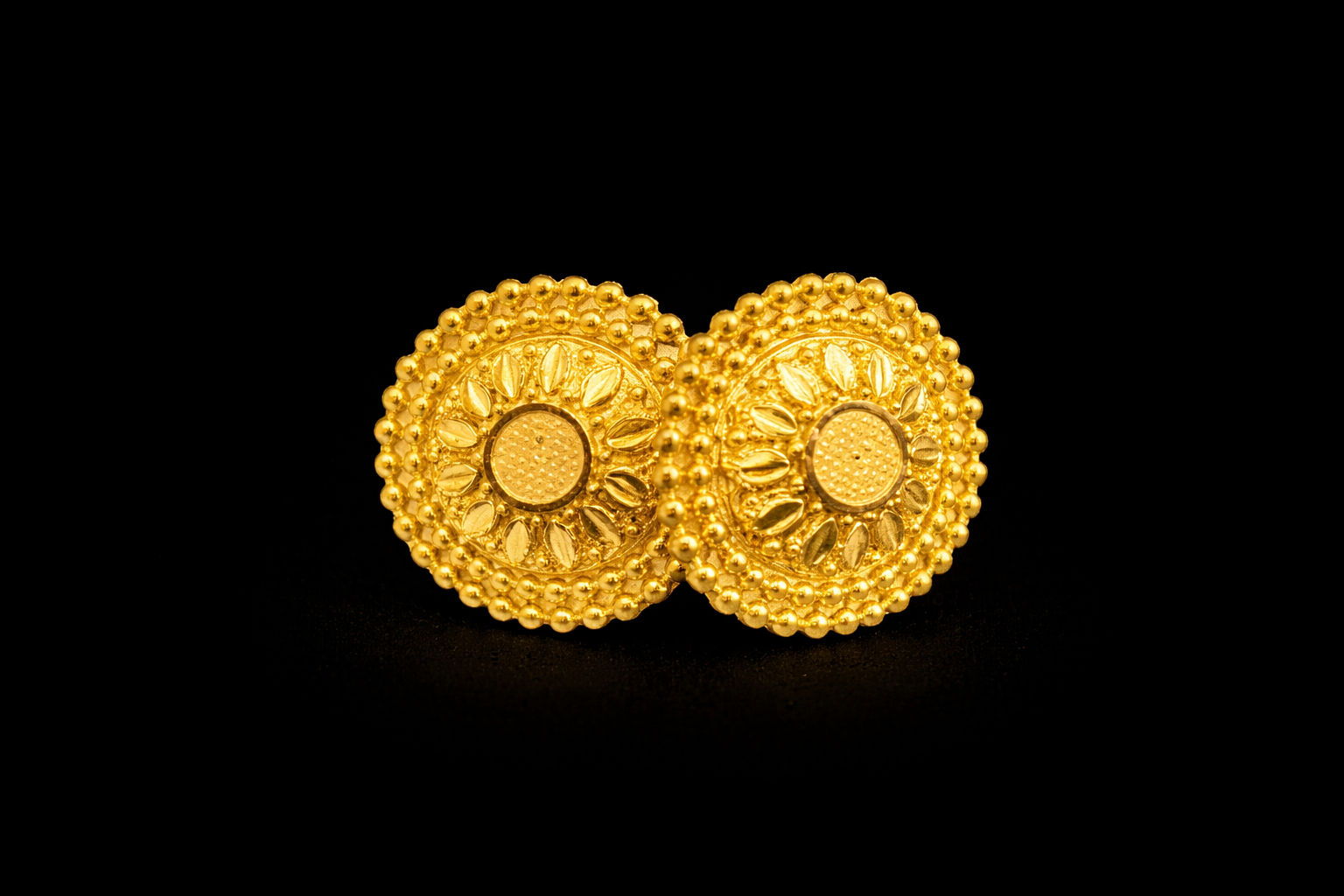Around the center there are small petal shaped patterns arranged like a flower. This floral design adds a decorative and attractive touch to the earrings. The outer edge has layered bead style borders that enhance the overall design and give the earrings a bold traditional appearance.