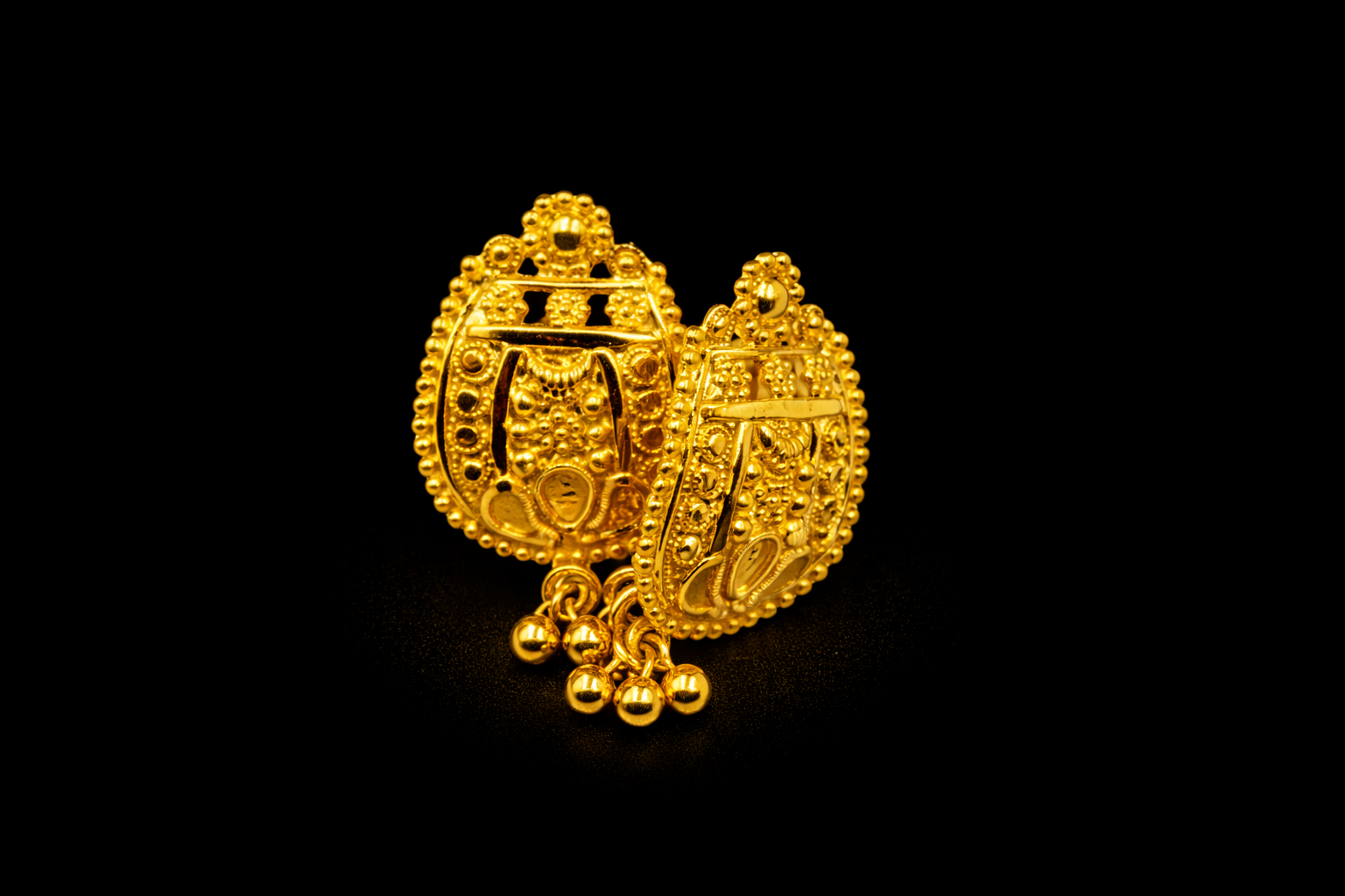 At the bottom of the earrings, small gold bead drops hang together and move gently when worn. These bead drops add a graceful finishing touch and enhance the traditional charm of the earrings.