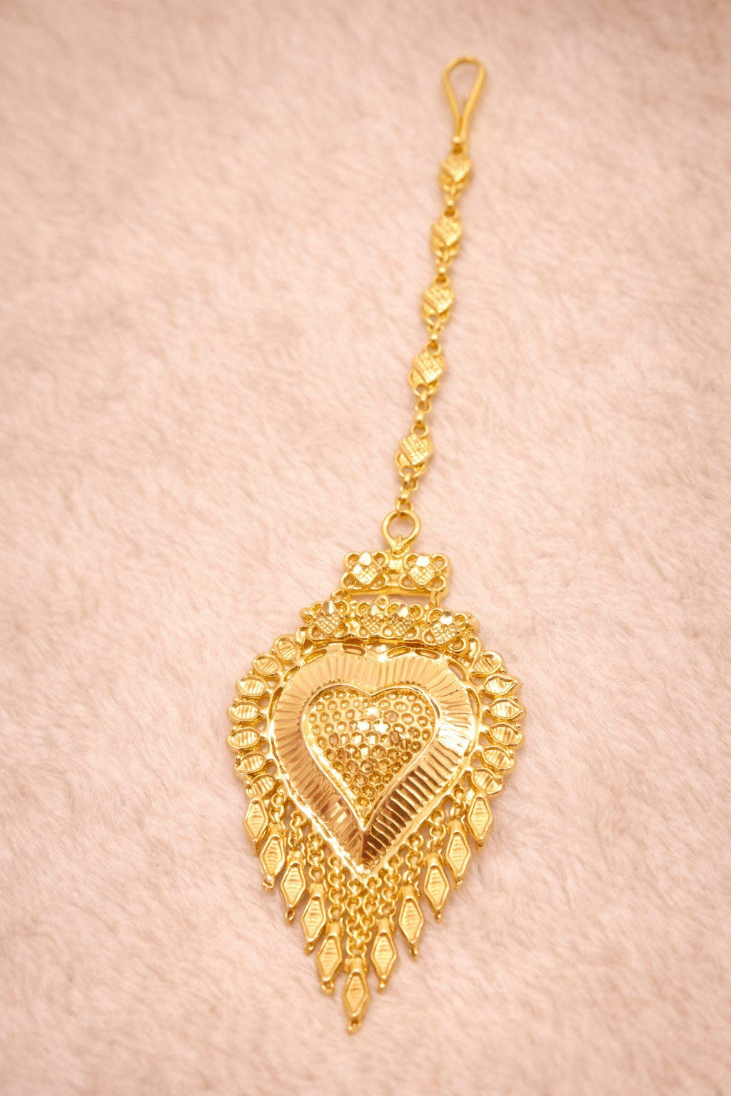 This beautiful gold mang tika features a bold heart-shaped centerpiece with detailed textured engraving at the center. The surrounding circular border is enhanced with patterned gold elements, giving it a rich and elegant finish.
