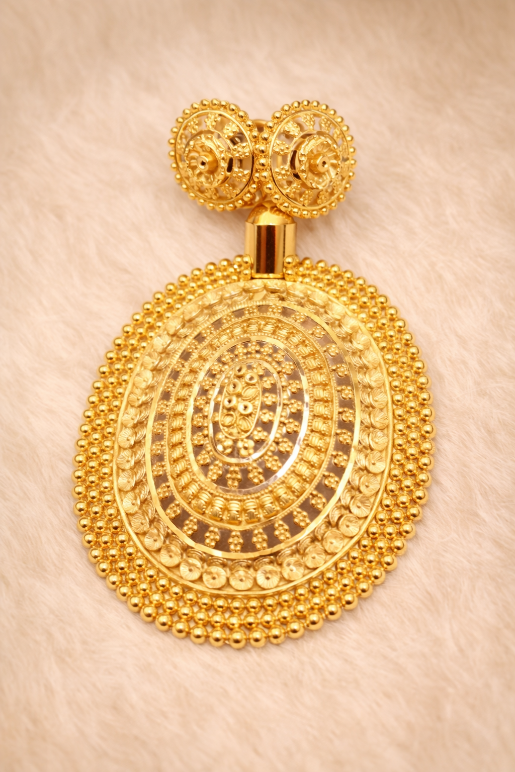 The pendant features multiple concentric circular layers filled with fine texture detailing. The outer border is finished with closely placed gold beads forming a bold decorative frame. The center section showcases detailed ornamental carving arranged in a structured circular layout, giving depth and dimension to the design.