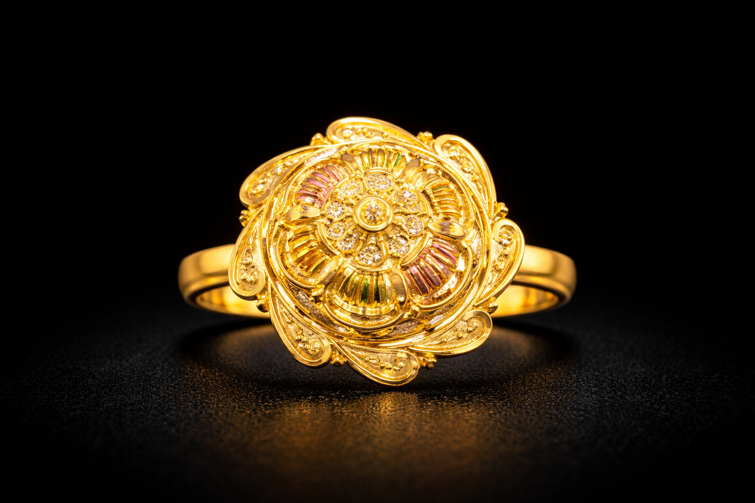 At the center of the ring, a small raised gold element is surrounded by delicate stone-like detailing arranged in a floral pattern. Around this central design, finely crafted petal shapes are decorated with subtle multicolor accents in shades of red and green, adding depth and visual contrast to the gold surface.
