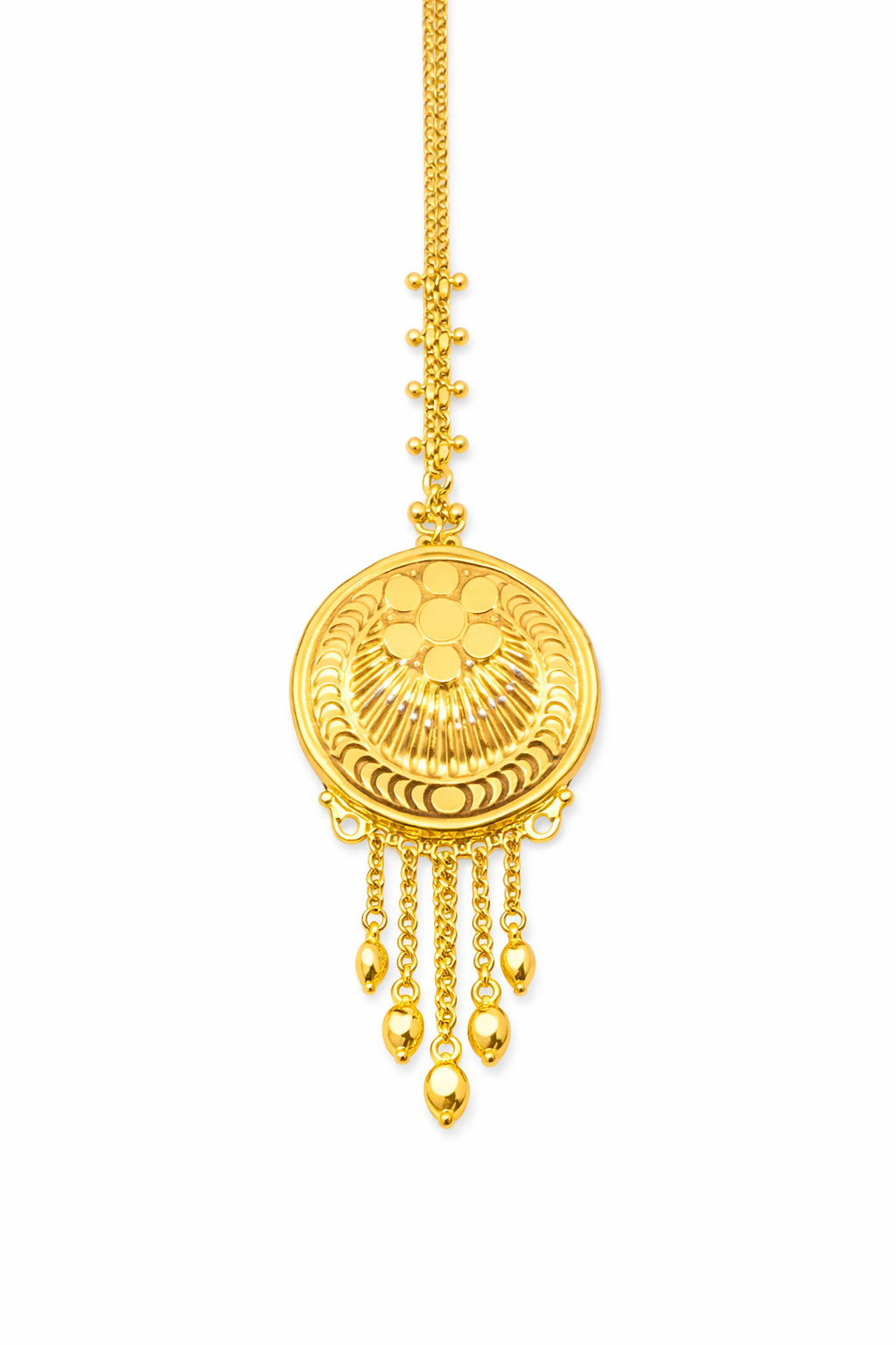 This elegant gold mang tika features a bold round centerpiece designed with layered floral and textured detailing. The upper section includes a finely linked chain accented with small gold beads on both sides, adding balance and structure to the design.