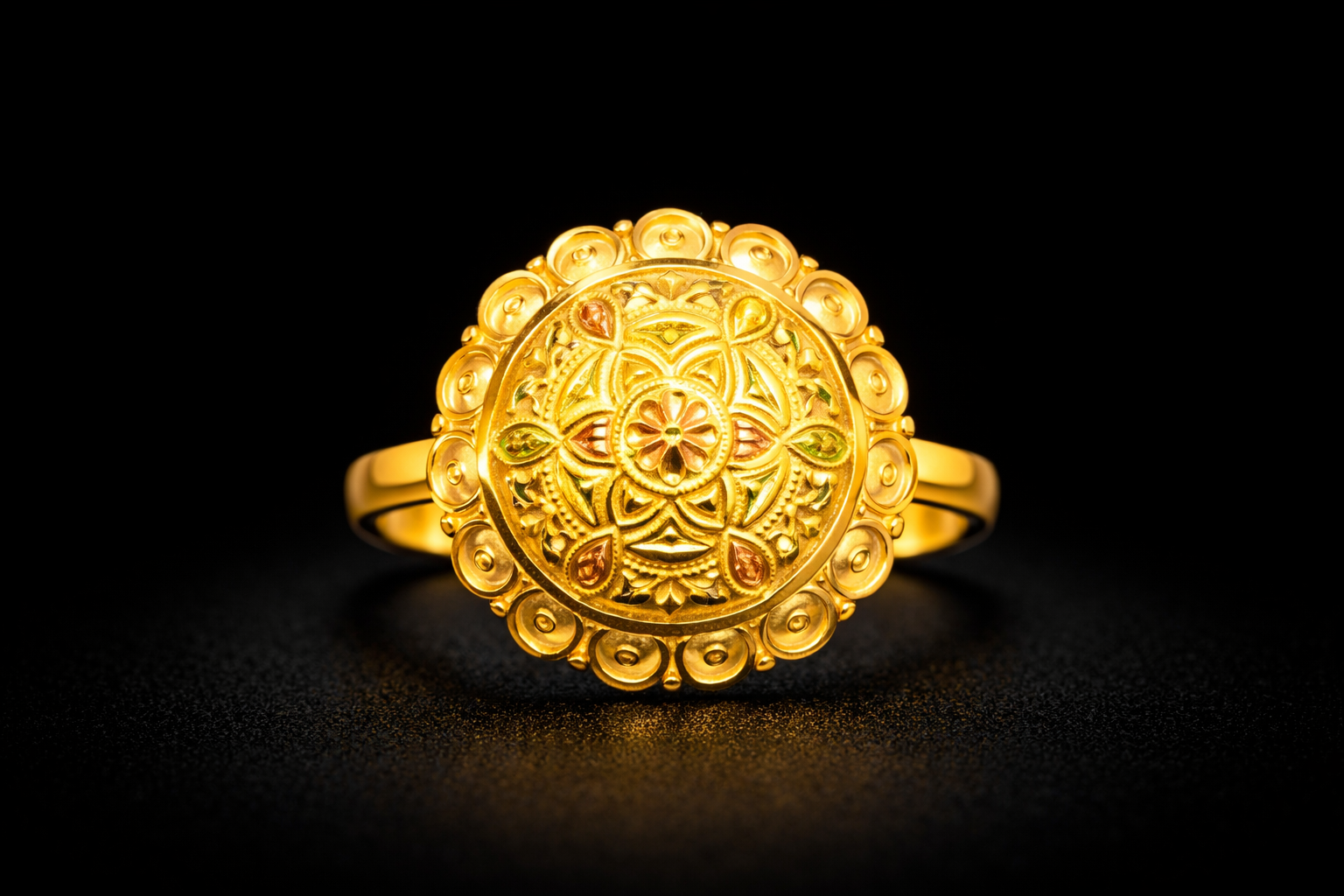 This elegant gold ring features a beautifully crafted circular design inspired by traditional floral patterns. The centerpiece of the ring displays a delicate flower motif surrounded by intricate ornamental detailing that reflects classic jewelry craftsmanship.
