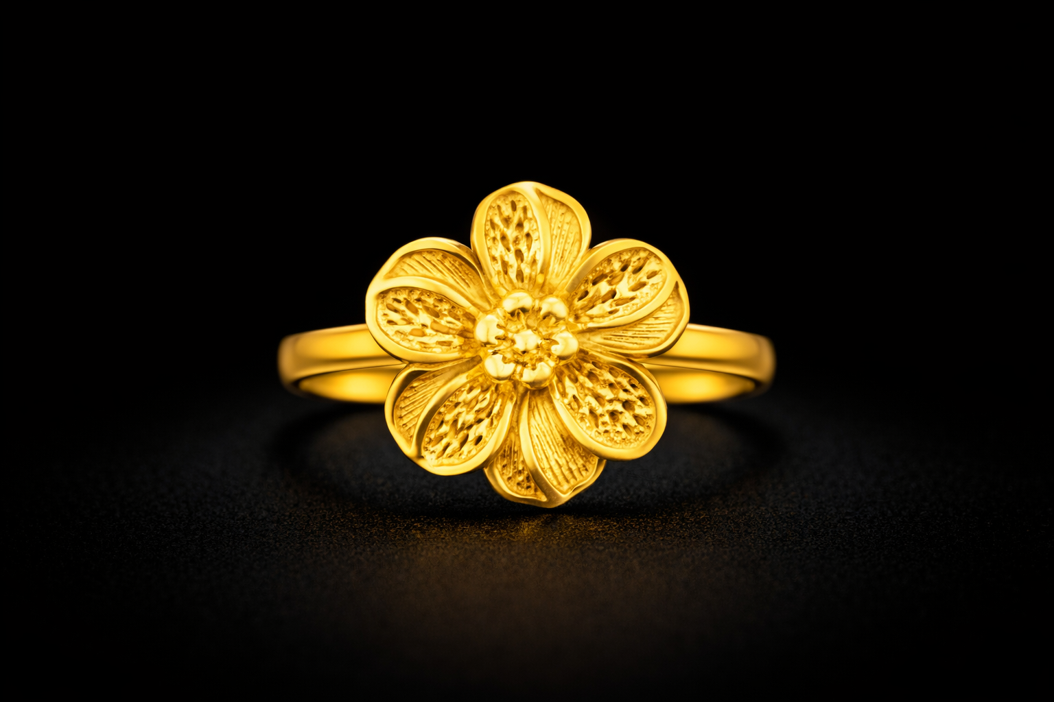 The detailed surface of the petals reflects light beautifully, enhancing the richness of the gold finish. The smooth and simple band keeps the focus on the floral motif while providing a comfortable fit for everyday wear.