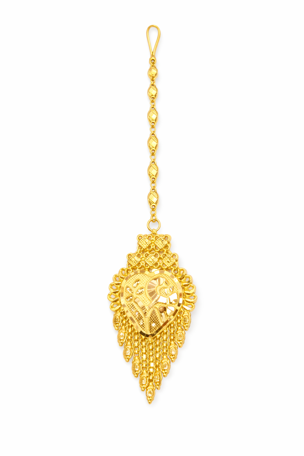 This eye-catching gold mang tika features a romantic heart-shaped centerpiece combined with intricate traditional detailing. The design beautifully balances softness and rich craftsmanship.