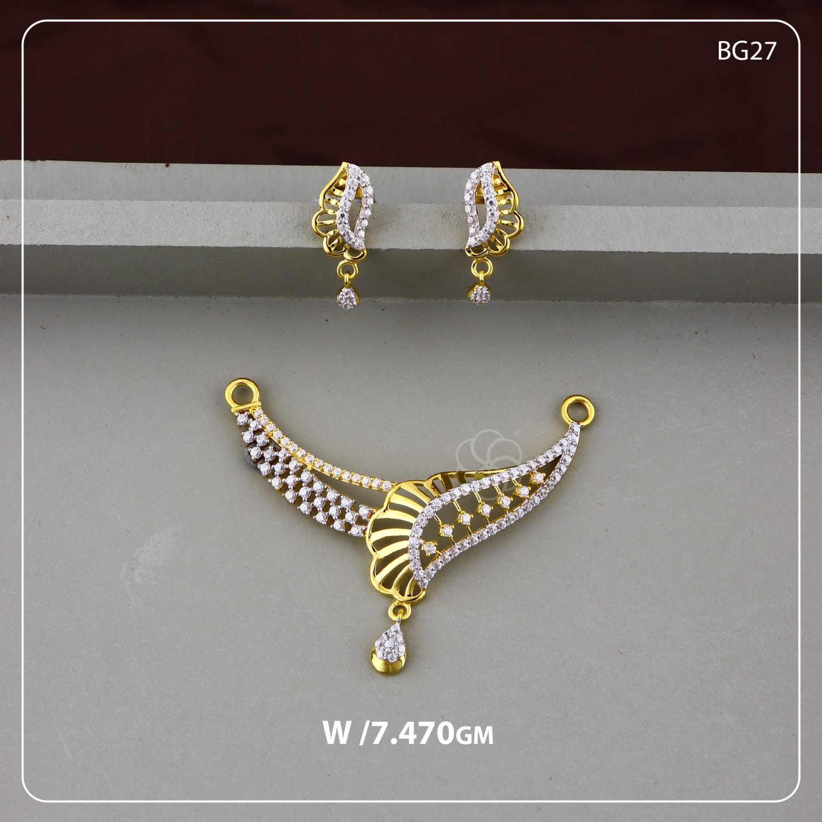 The earrings follow a leaf-inspired curved pattern with stone detailing and a small drop, matching perfectly with the centerpiece.