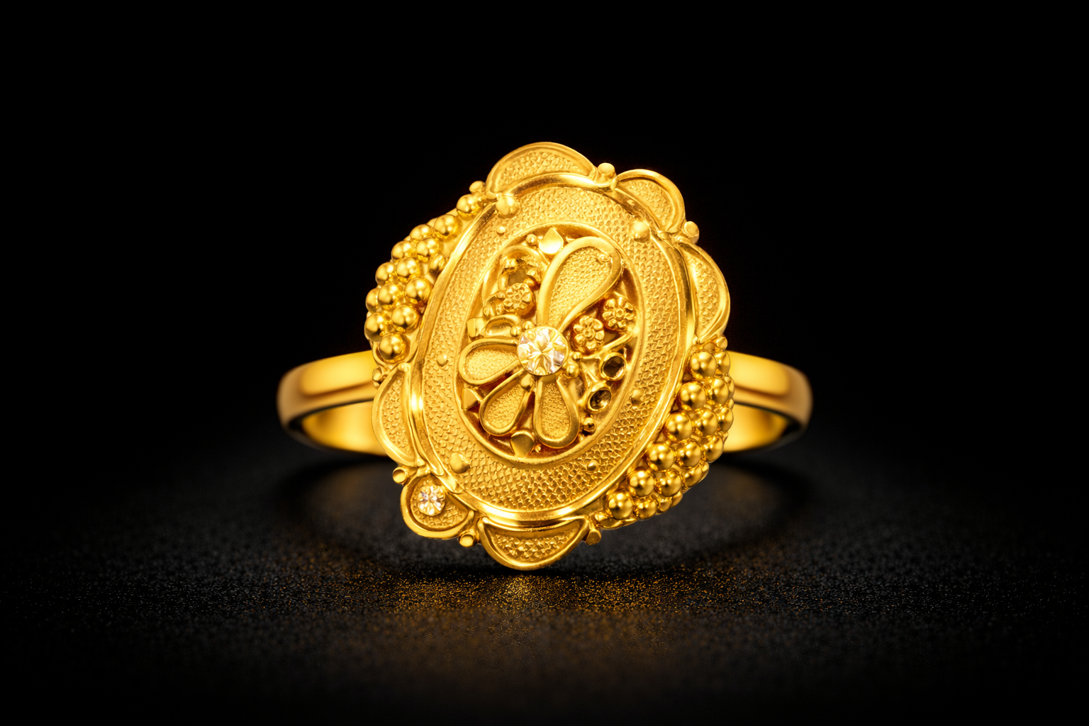 This beautifully crafted gold ring features an elegant oval shaped centerpiece that highlights fine traditional craftsmanship. The design combines floral artistry with textured gold work, creating a rich and graceful appearance.
