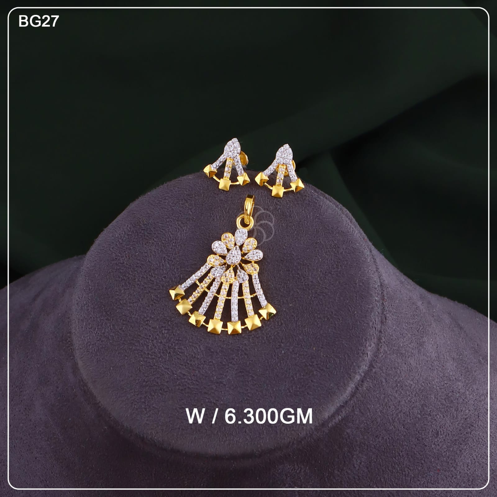 This set has a bright and festive look with a mix of floral and fan-style detailing. The pendant starts with a flower-shaped top, made with small stones that create a neat and sparkling center.