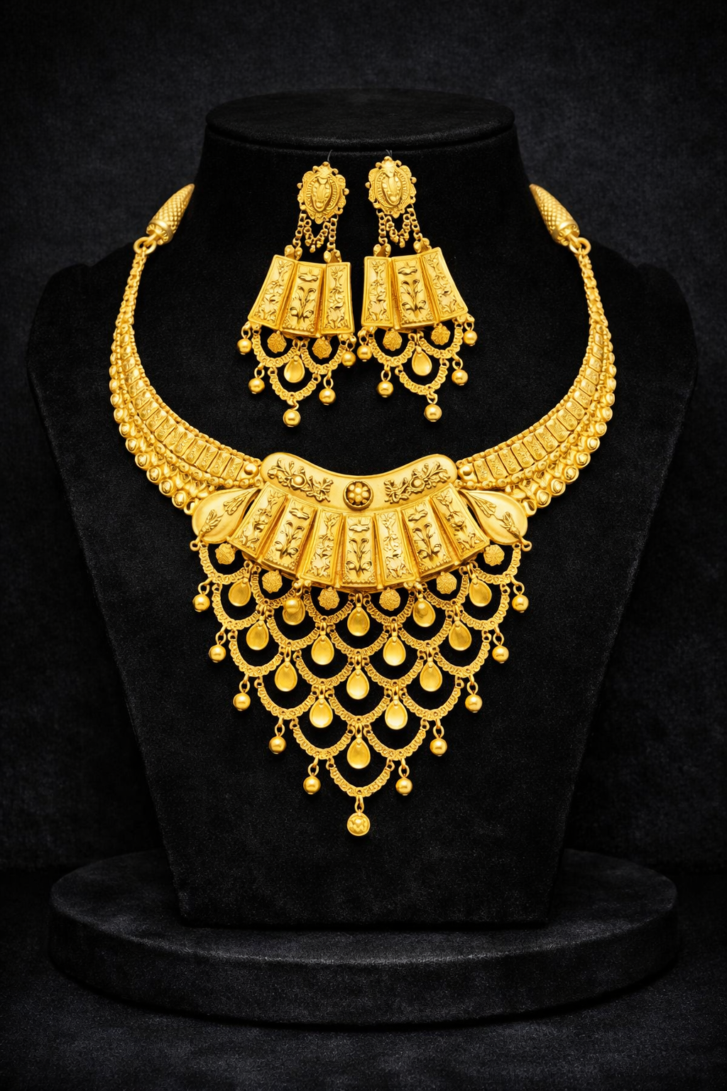This is a heavy traditional gold necklace set designed for grand occasions.