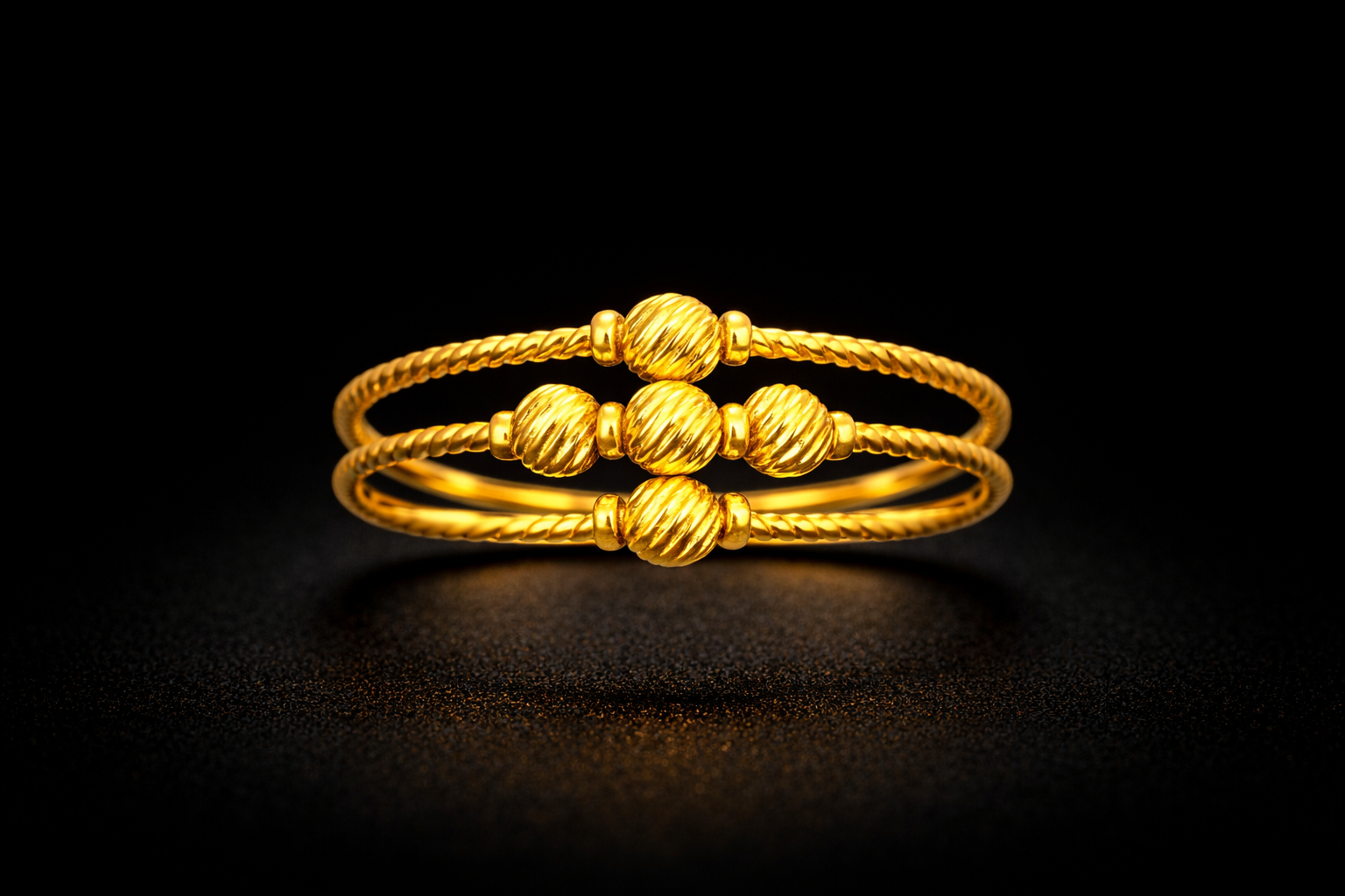 This elegant gold ring features a sleek double band design enhanced with decorative ribbed beads. The design is simple yet stylish, making it perfect for those who appreciate modern minimal jewelry with a touch of texture.