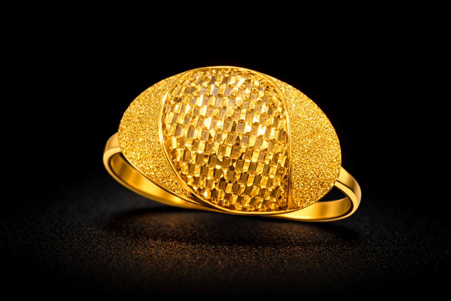This elegant gold ring features a sleek oval design that blends modern styling with rich texture. The ring stands out with its balanced composition, combining a detailed central pattern with soft textured sides.