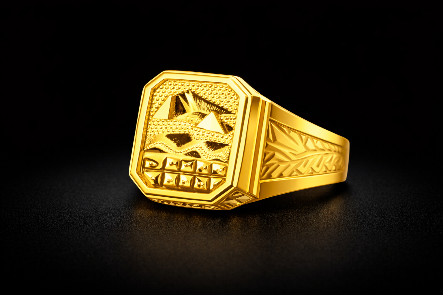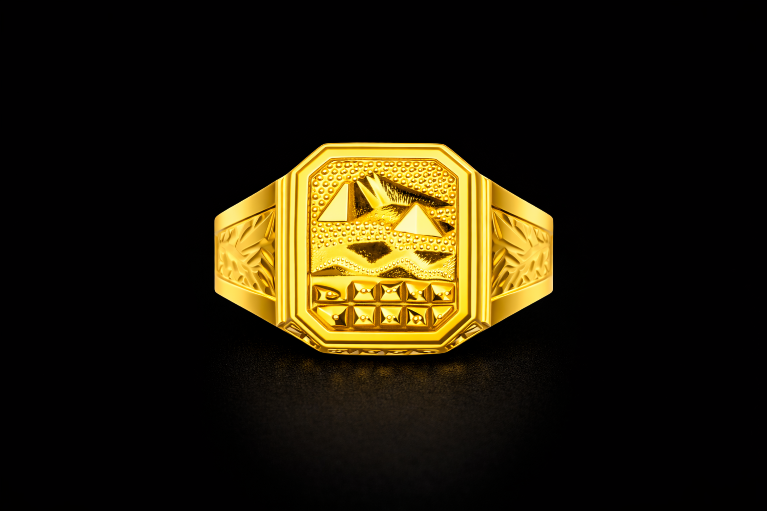 This gold ring has an octagon shape on top. The top part has small raised design and pattern which makes the ring look different and attractive.