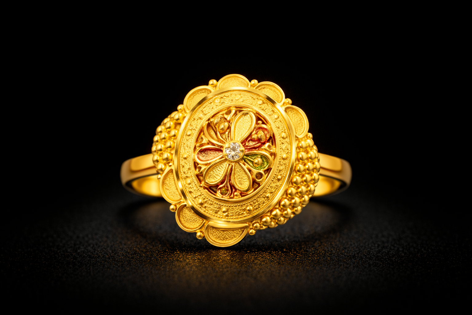This elegant gold ring features a beautifully crafted oval centerpiece that highlights traditional floral artistry. The design combines intricate gold textures with delicate enamel accents, creating a rich and sophisticated appearance.