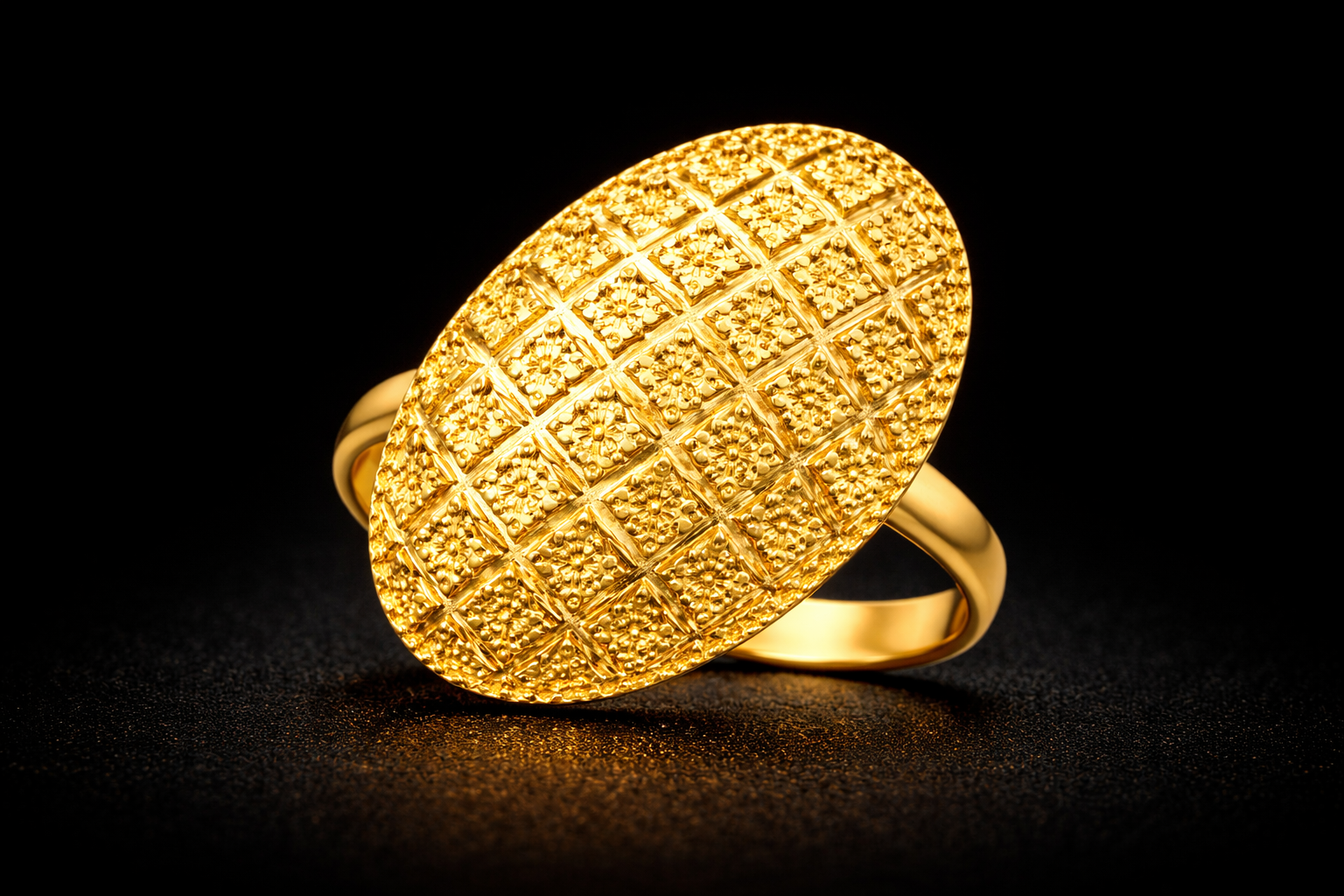 Oval Textured Gold Statement Ring with Floral Grid Pattern