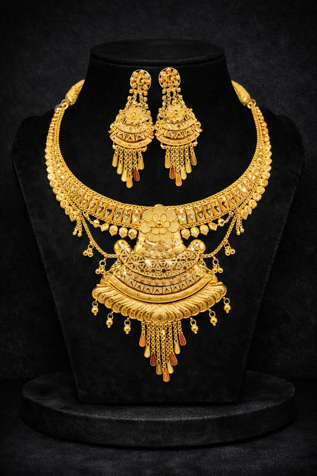 In the center, there is a big floral design which becomes the main highlight of the necklace. Below the flower, there are layered curved panels with fine carving and textured detailing.