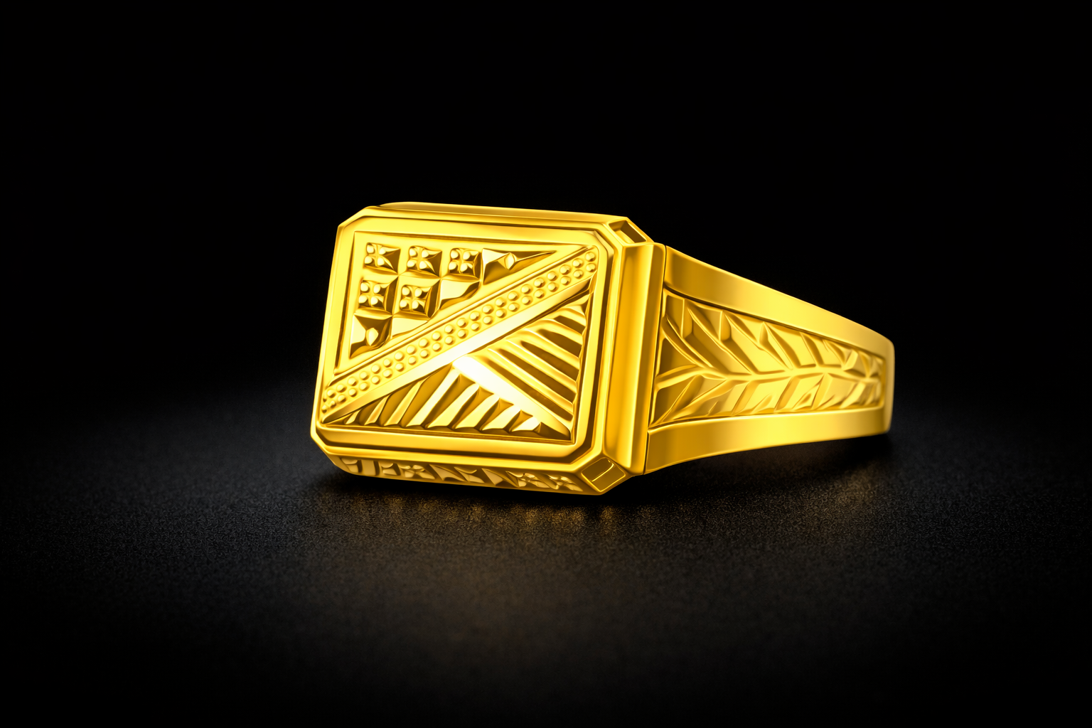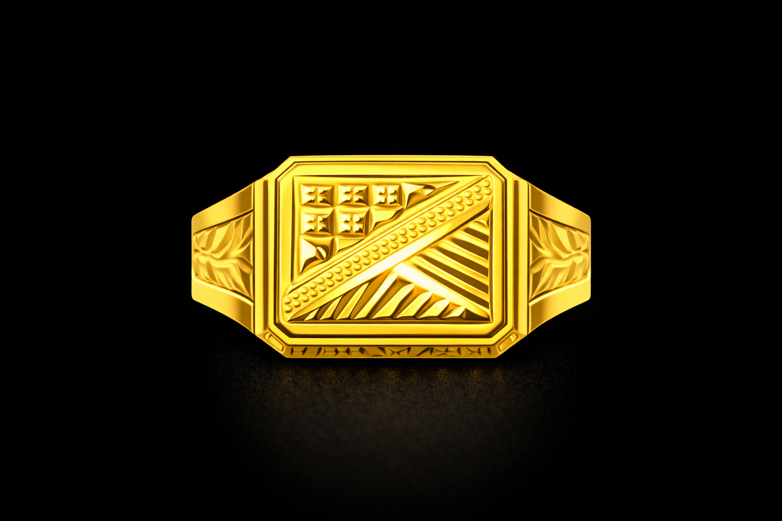 A gold ring with square top and stylish line design. Strong and smart look for men.