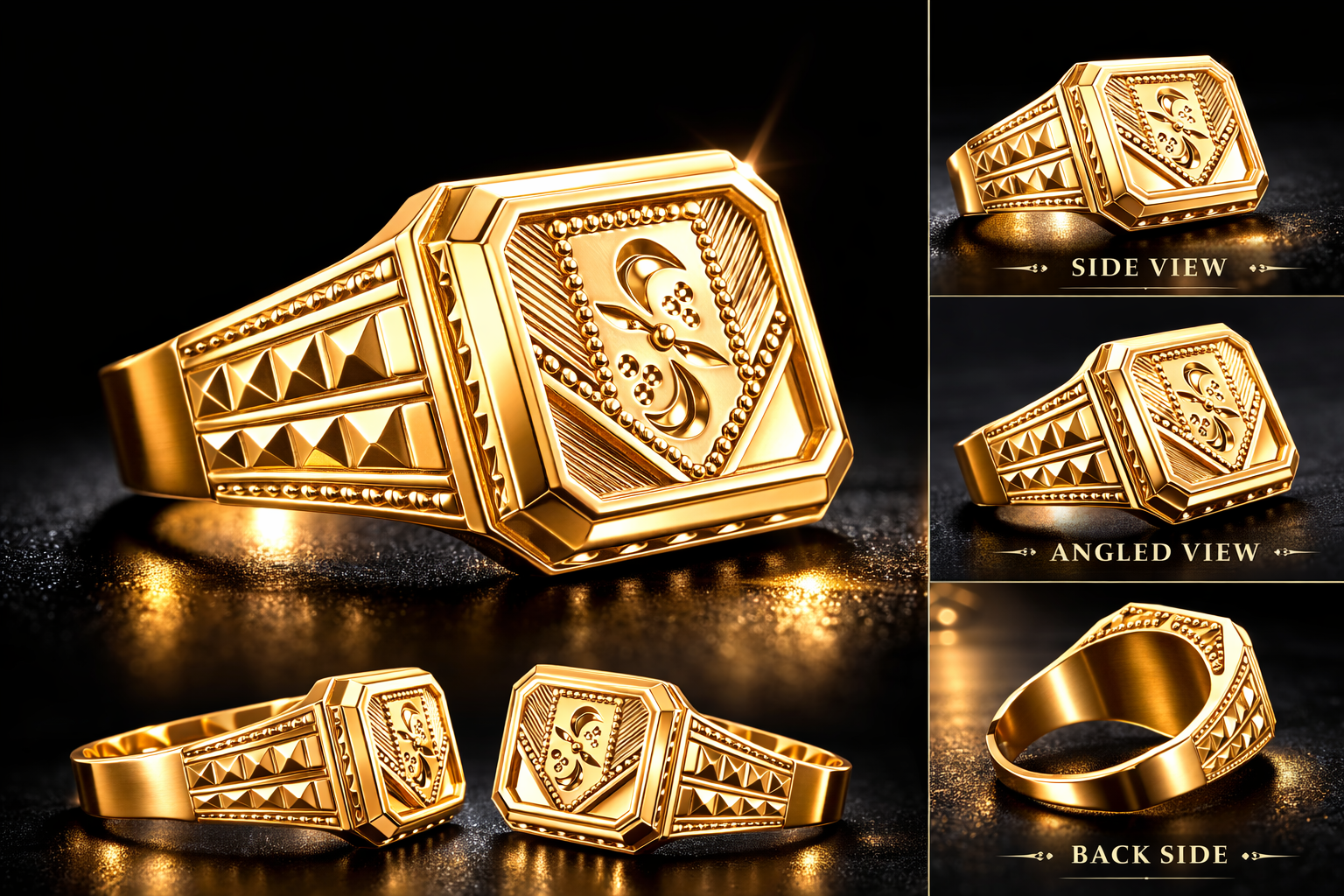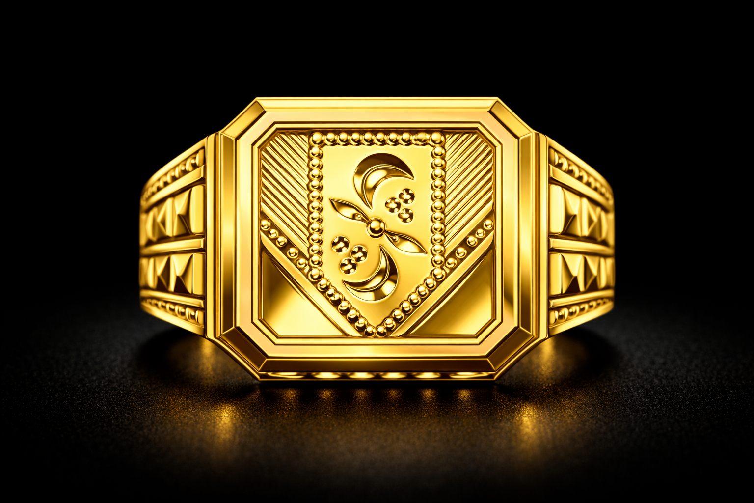 The gold finish is bright and shiny. The ring looks bold and heavy. It is a good choice for men who like traditional and stylish gold jewellery.