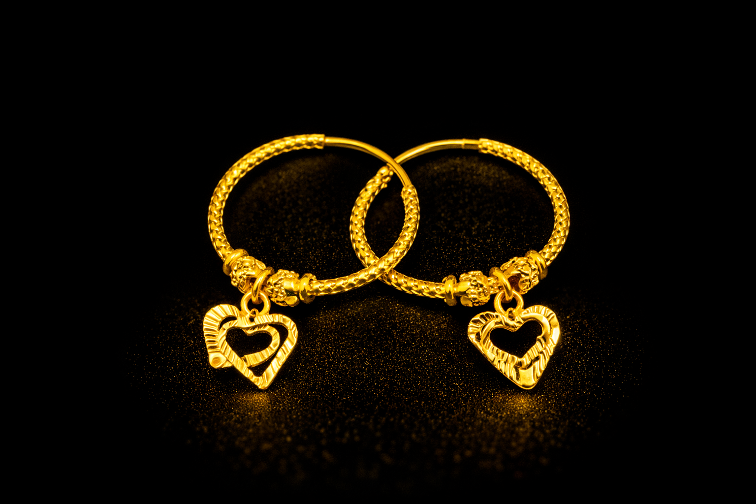 Textured Gold Bali Hoop Earrings with Double Heart Charm